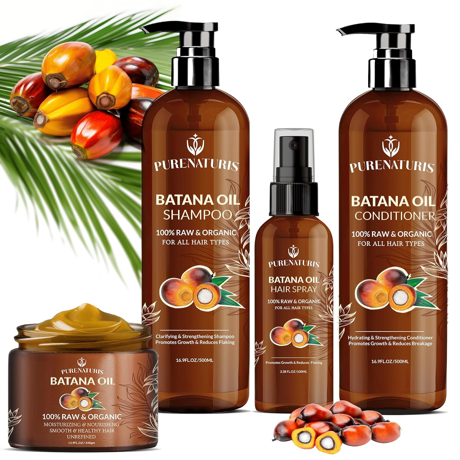 100% Natural Raw Organic Batana Oil Sulfate-Free Complete Hair Growth , Anti-Hair Loss & Repair System Kit – Shampoo, Conditioner, Hair Mask, & Leave-In Spray | Thickness & Prevents Loss for Men Women