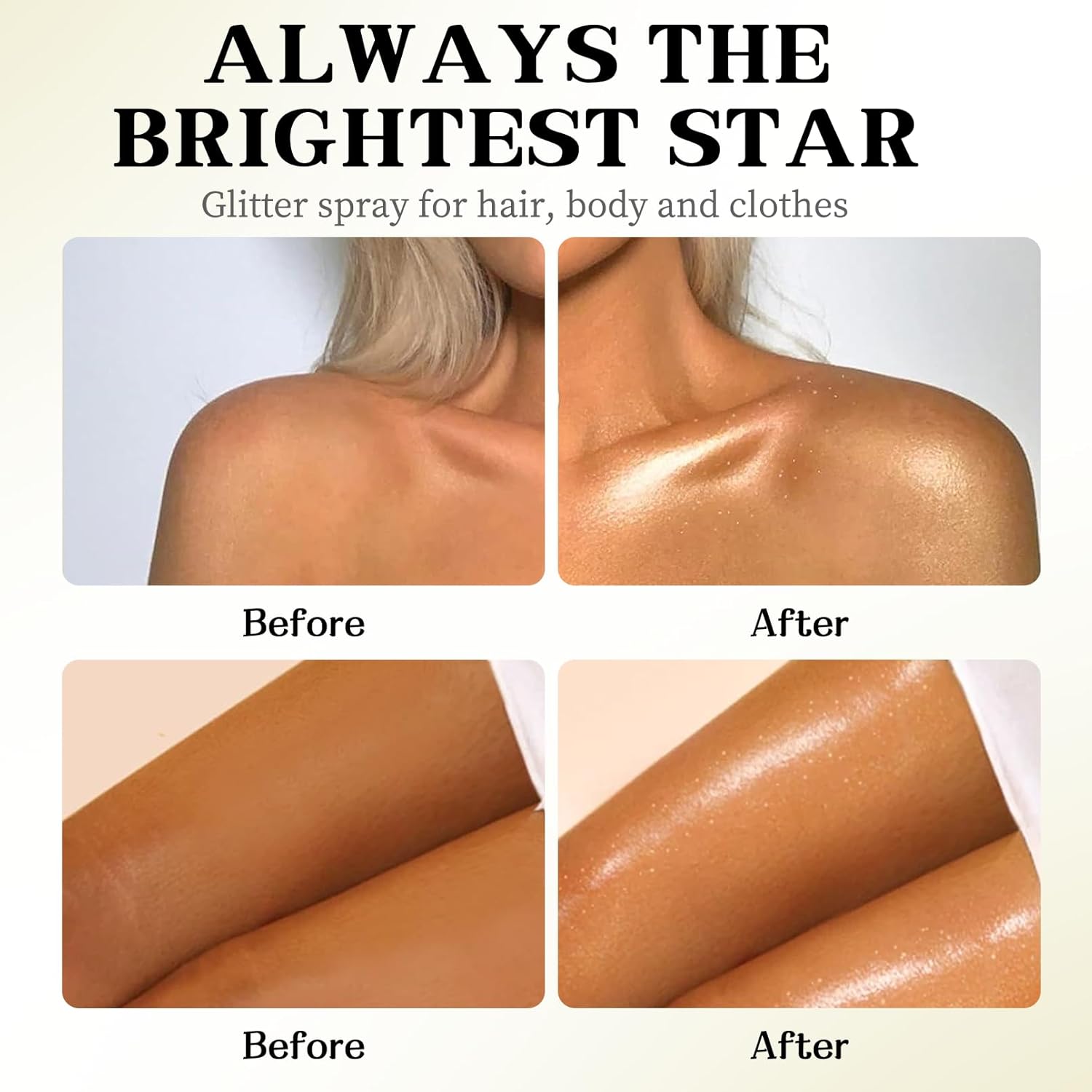 - Multi-Purpose Glitter Spray: Our body glitter spray is made of glitter particles, delivering a charming shimmer effect. You can spray it on your body, hair, face, skin, and even clothes. It will make you the center of attention under the lights at parties or nightclubs