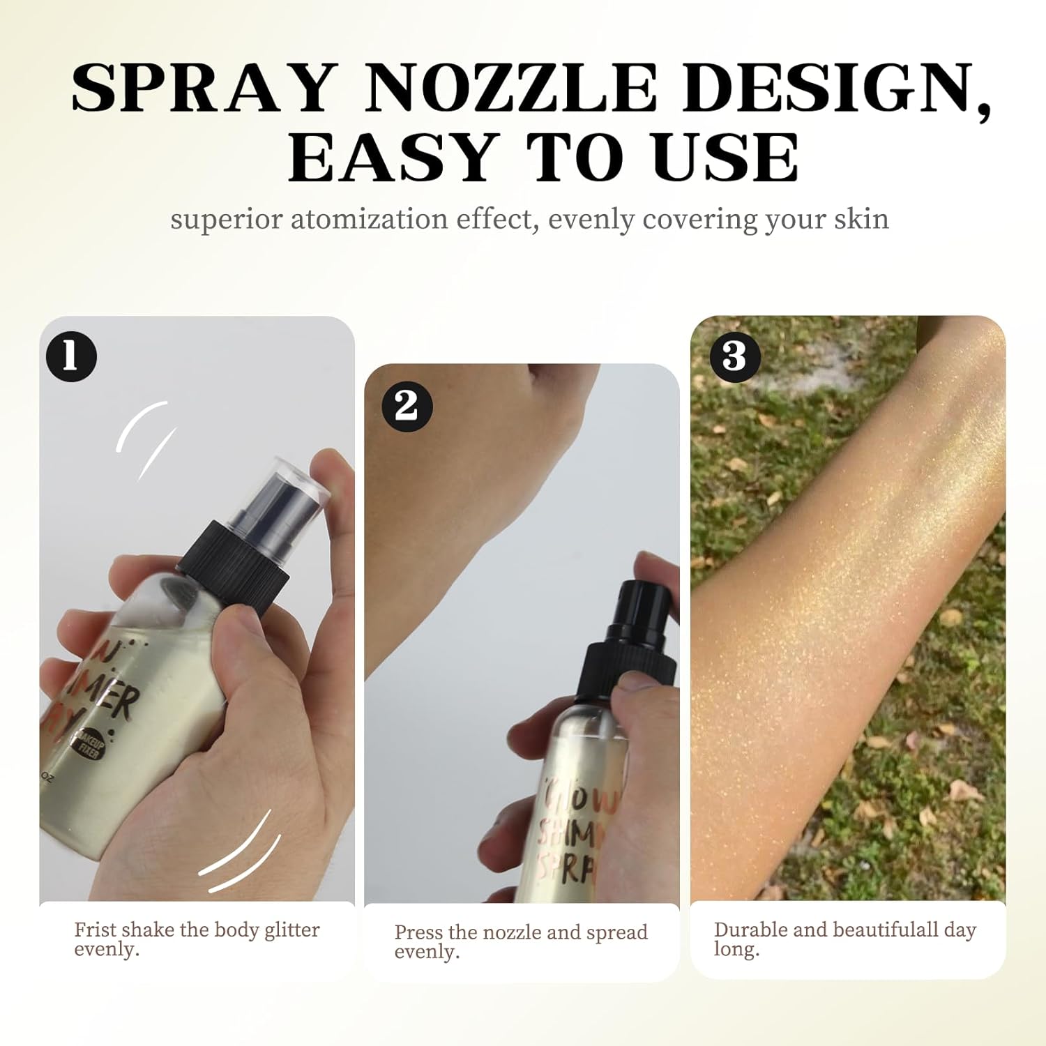 - Long-lasting: Body shimmer spray typically has long-lasting, and quick-drying effects. The tiny particles formed on the skin can remain on the skin surface for a long time, making your skin look radiant all day long. No need for frequent touch-ups, keeping you shining all the time