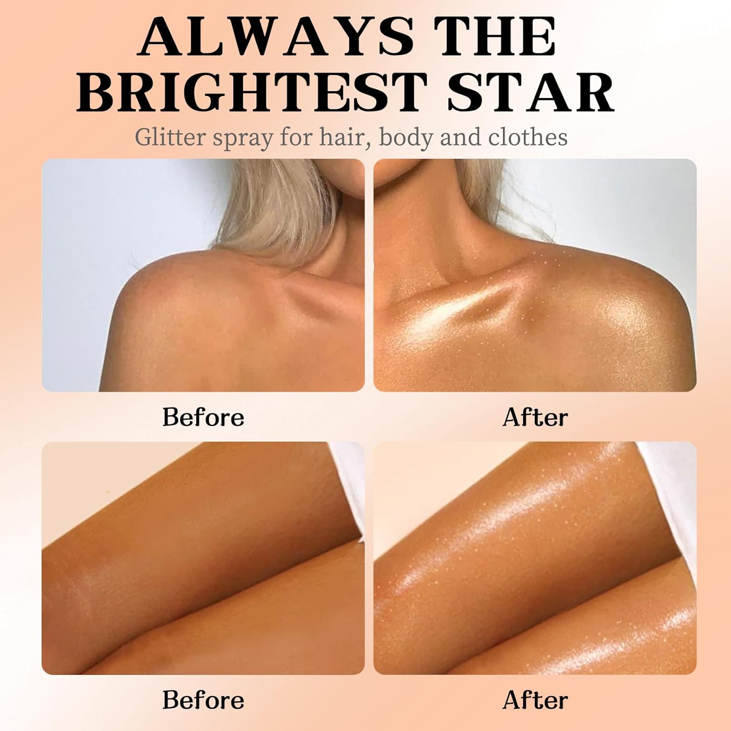 - Multi-Purpose Glitter Spray: Our body glitter spray is made of glitter particles, delivering a charming shimmer effect. You can spray it on your body, hair, face, skin, and even clothes. It will make you the center of attention under the lights at parties or nightclubs