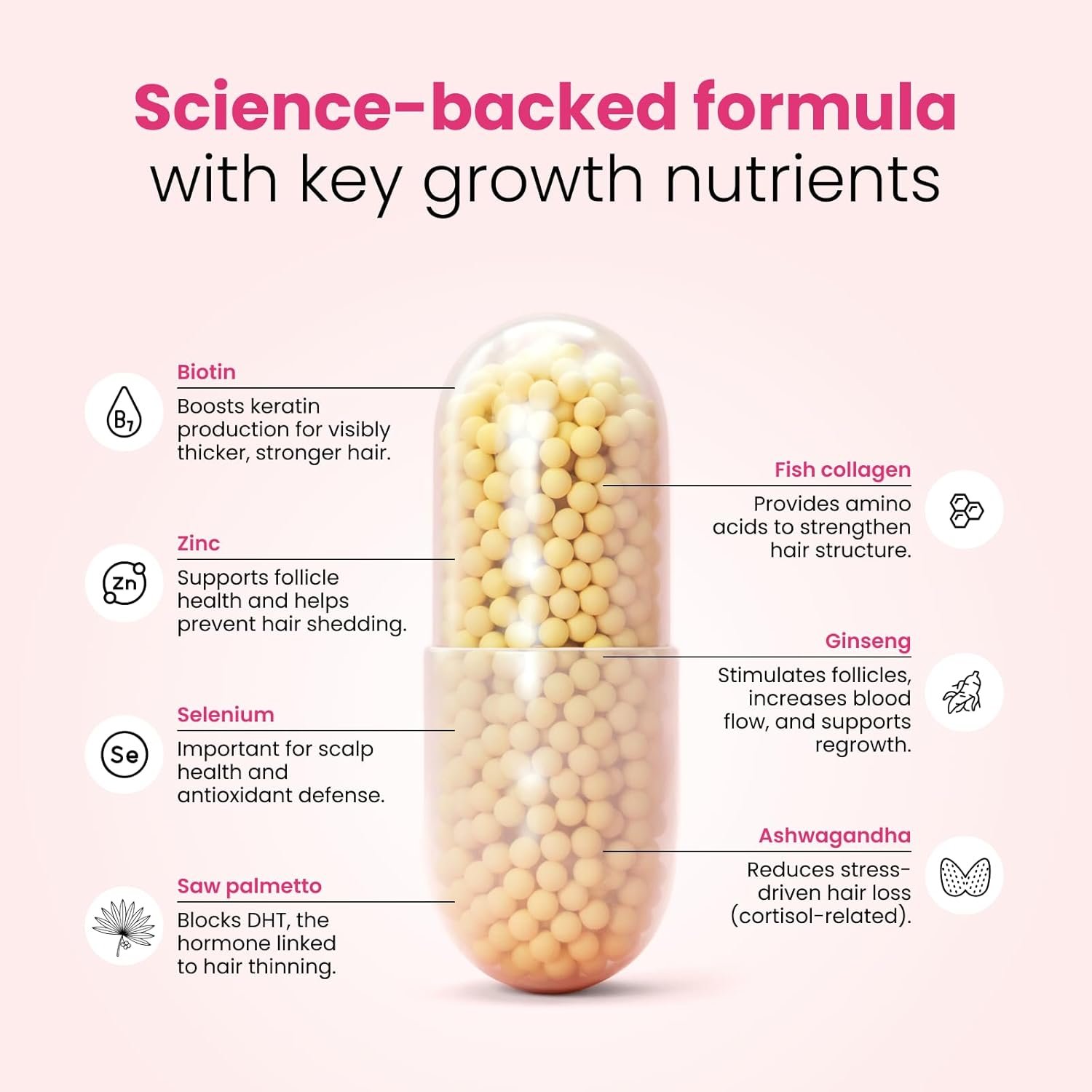 - NOURISHING VITAMINS & MINERALS: Loaded with Vitamin D3, Biotin, and Zinc, these hair regrowth vitamins for women promote scalp health and nourishes follicles from the inside out. Perfect for thinning hair and overall regrowth support.