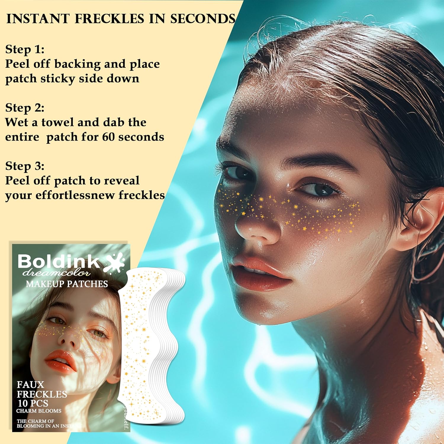 - EASY TO APPLY - Using our Boldink Face Glitter speckle patches is easy and quick! Simply peel off the backing, apply the sticky side to your skin, and press with a damp washcloth for 60 seconds. Once you remove the patch, you'll be amazed by your new sparkly look! No fuss, no mess, and a natural-looking glittery look in just minutes. Perfect for those times when you want to add a touch of sparkle to your look!