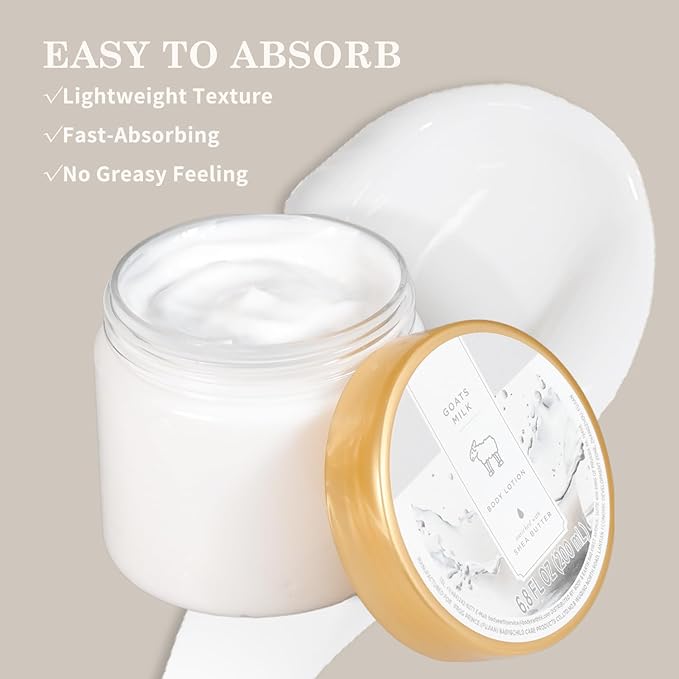 - EASY TO ABSORB: The Goat Milk Body Lotion has a fast absorbing, non greasy formula that can be quickly absorbed into the skin without leaving any greasy or viscous residues, providing hydration for a whole day. Let you enjoy the convenience of body lotion without leaving any greasy feeling.