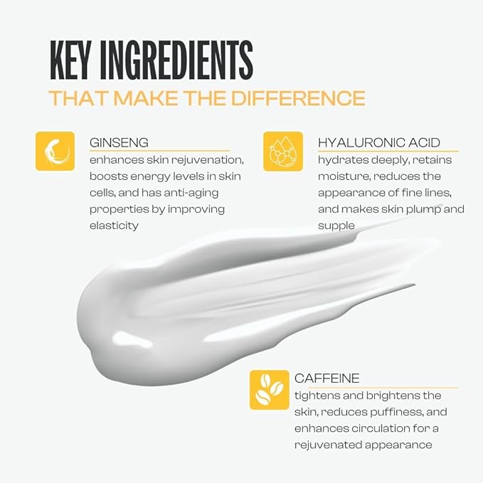 - Nourishing and Energizing: Formulated with ginseng extract and caffeine, this eye cream for puffiness and bags under eyes revitalizes the delicate under-eye area, delivering visible radiance.