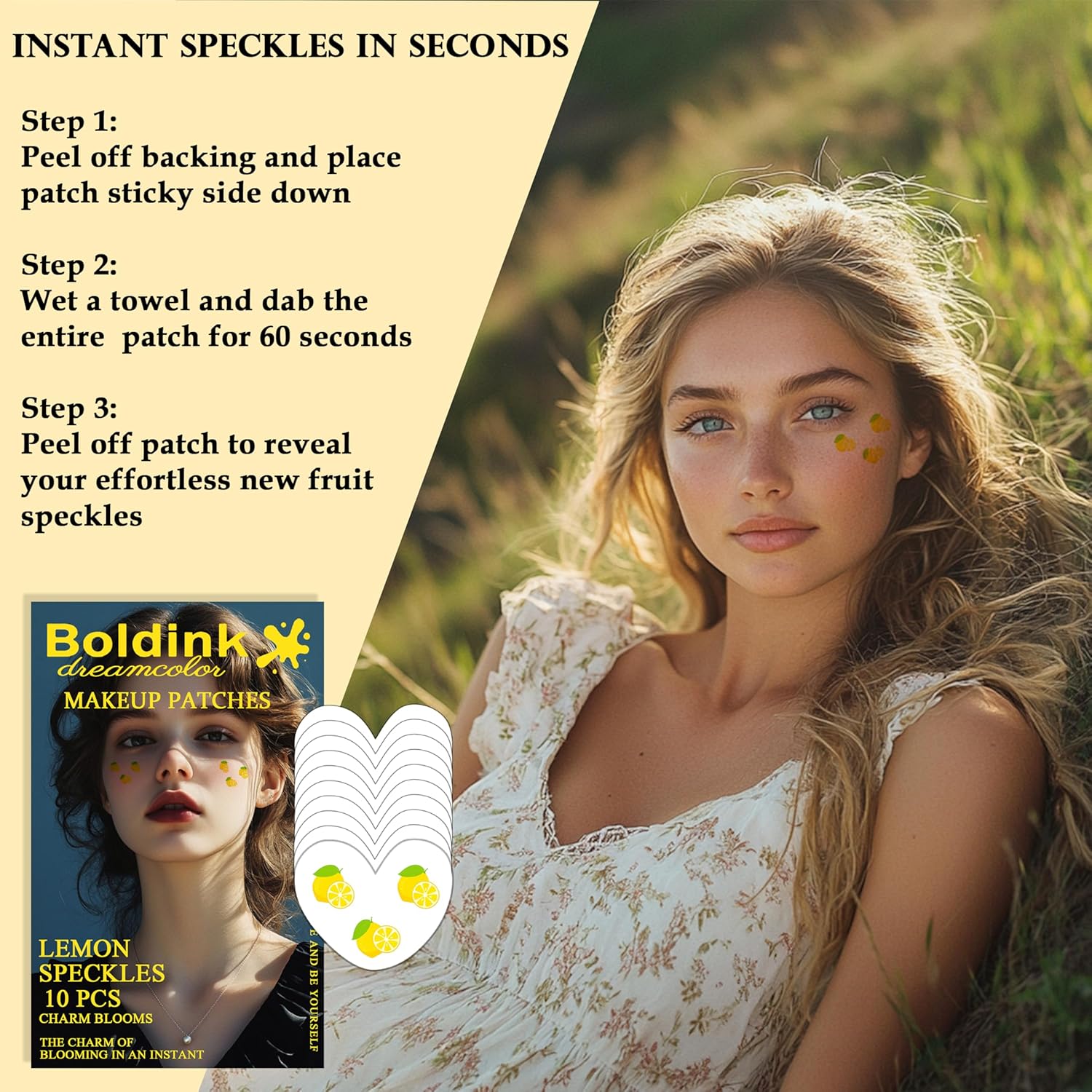 - EASY TO APPLY - Using our Boldink Face fruit speckle patches is easy and quick! Simply peel off the backing, apply the sticky side to your skin, and press with a damp washcloth for 60 seconds. Once you remove the patch, you'll be amazed by your new sparkly look! No fuss, no mess, and a natural-looking glittery look in just minutes. Perfect for those times when you want to add a touch of sparkle to your look!