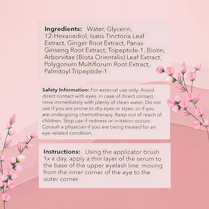 - Performance-based botanicals: Biotin, ginger root, panax ginseng root, and isatis tinctoria leaf extract stimulate longer, thicker and healthier lashes