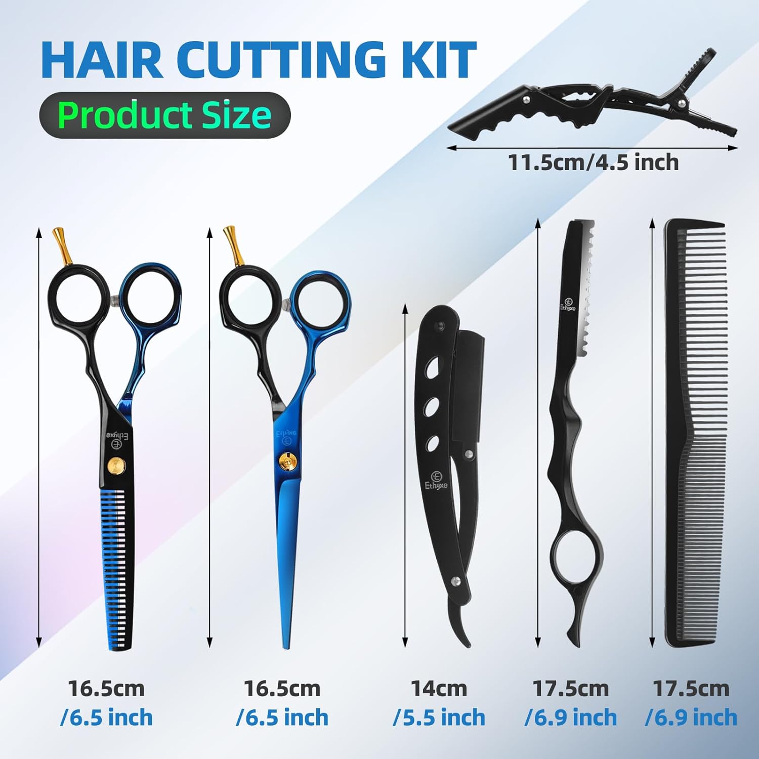 Hair Cutting Shears Sets - Professional 9 PCS Haircut Scissors Kit with 6.5" Thinning/Texturizing Scissors (29 Teeth) and Straight Shears for Men Women Home Salon (Black & Blue)