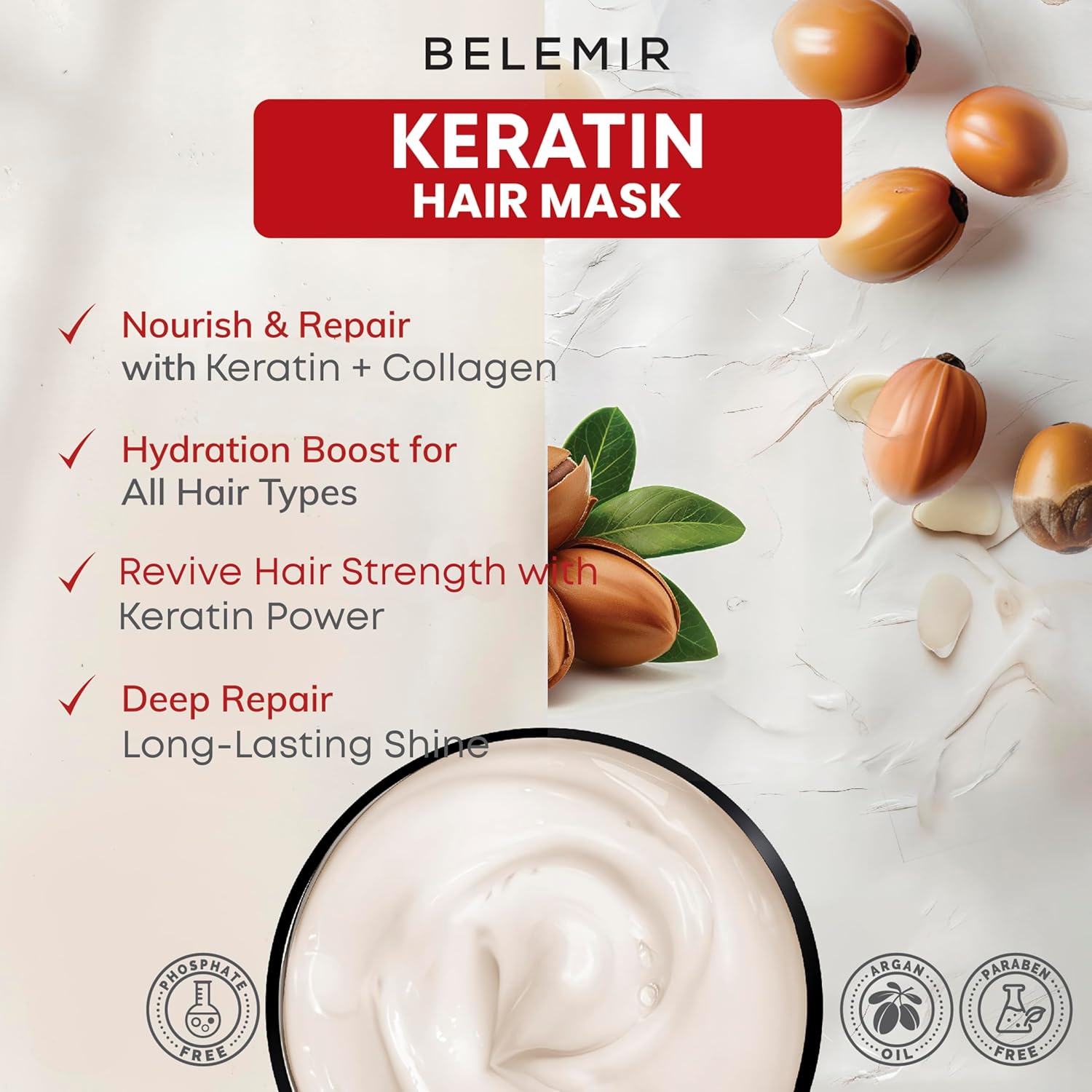 BELEMIR Keratin Hair Mask – Deep Conditioning for Damaged Hair – Collagen & Argan Oil Treatment – Hydrating & Repairing – Sulfate & Paraben Free – 500 ml / 16.9 fl oz