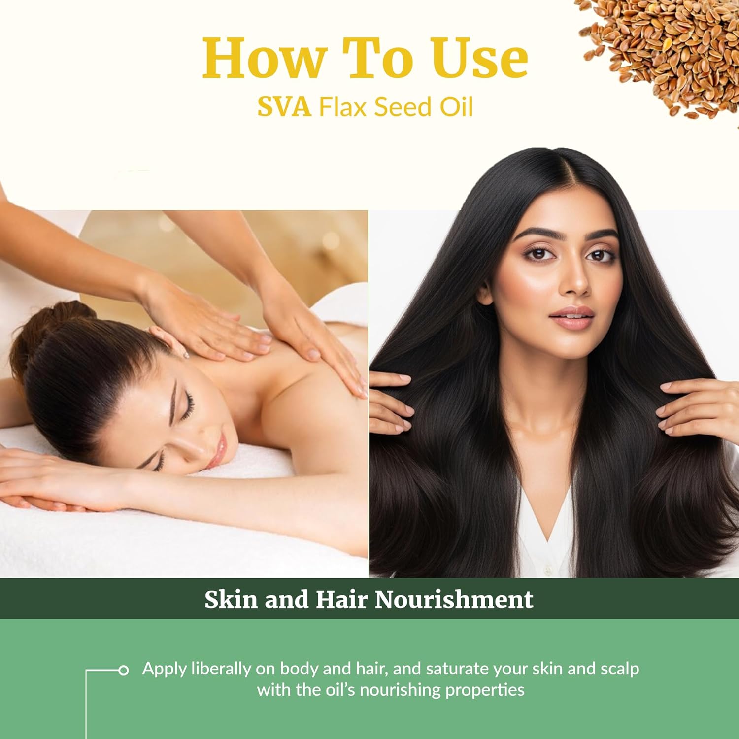 - How To Use: SVA Flax Seed Oil organic cold pressed is easy to use. Pour a few drops on your palm and gently massage your scalp and skin with it for a few minutes. Leave it for some time and wash it off with a mild cleanser. You may use Flax Seed oil cold-pressed organic for hair or skin and leave the oil overnight for better results.