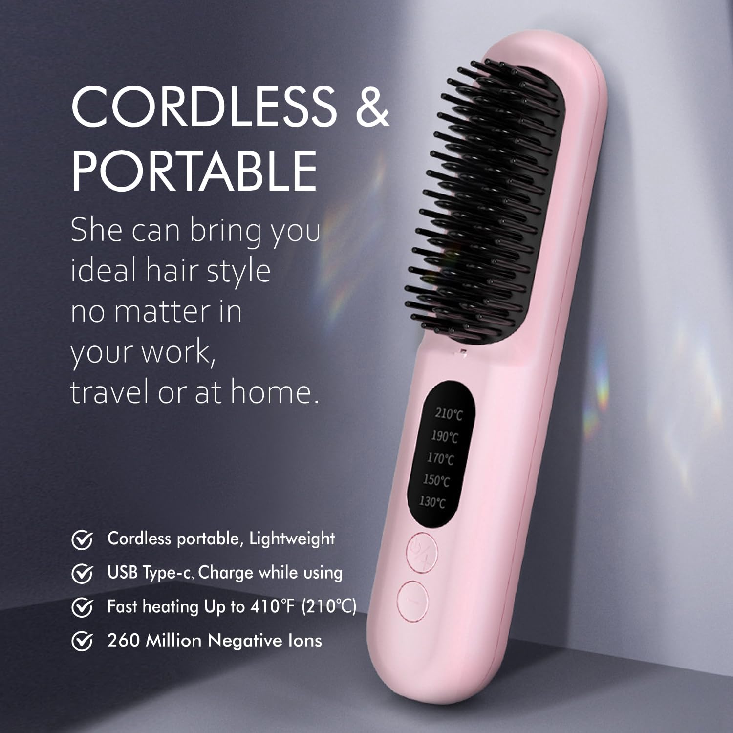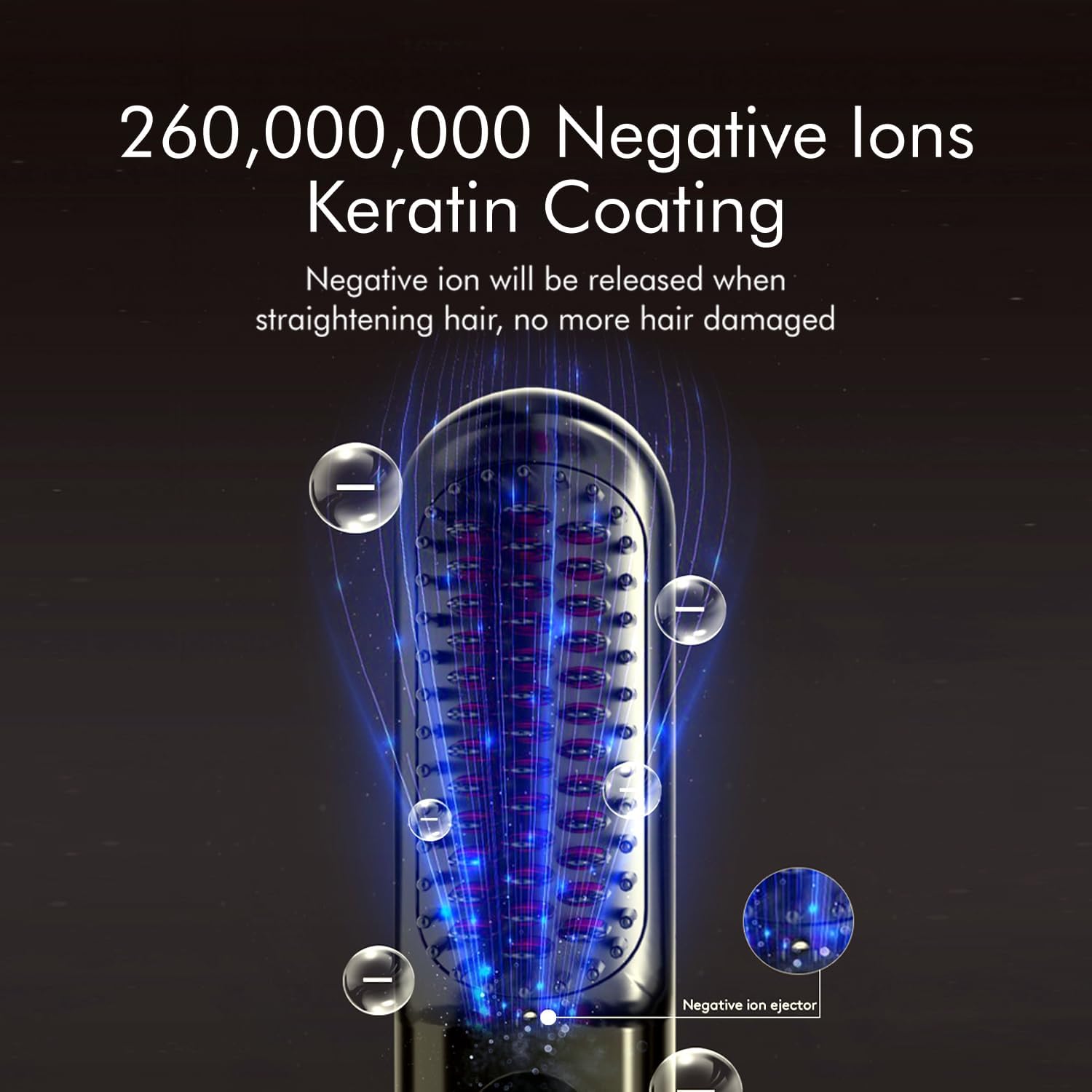 - ๐ 260 MILLION NEGATIVE ION HAIR STRAIGHTENER & KERATIN COATING - Lock moisture and reduce frizz: This travel cordless straight hair comb emits 260 million negative ions while heating, effectively neutralizing static electricity in the hair. Using keratin coating on comb teeth, helps retain hair moisture, resulting in softer, silkier, and shinier hair.