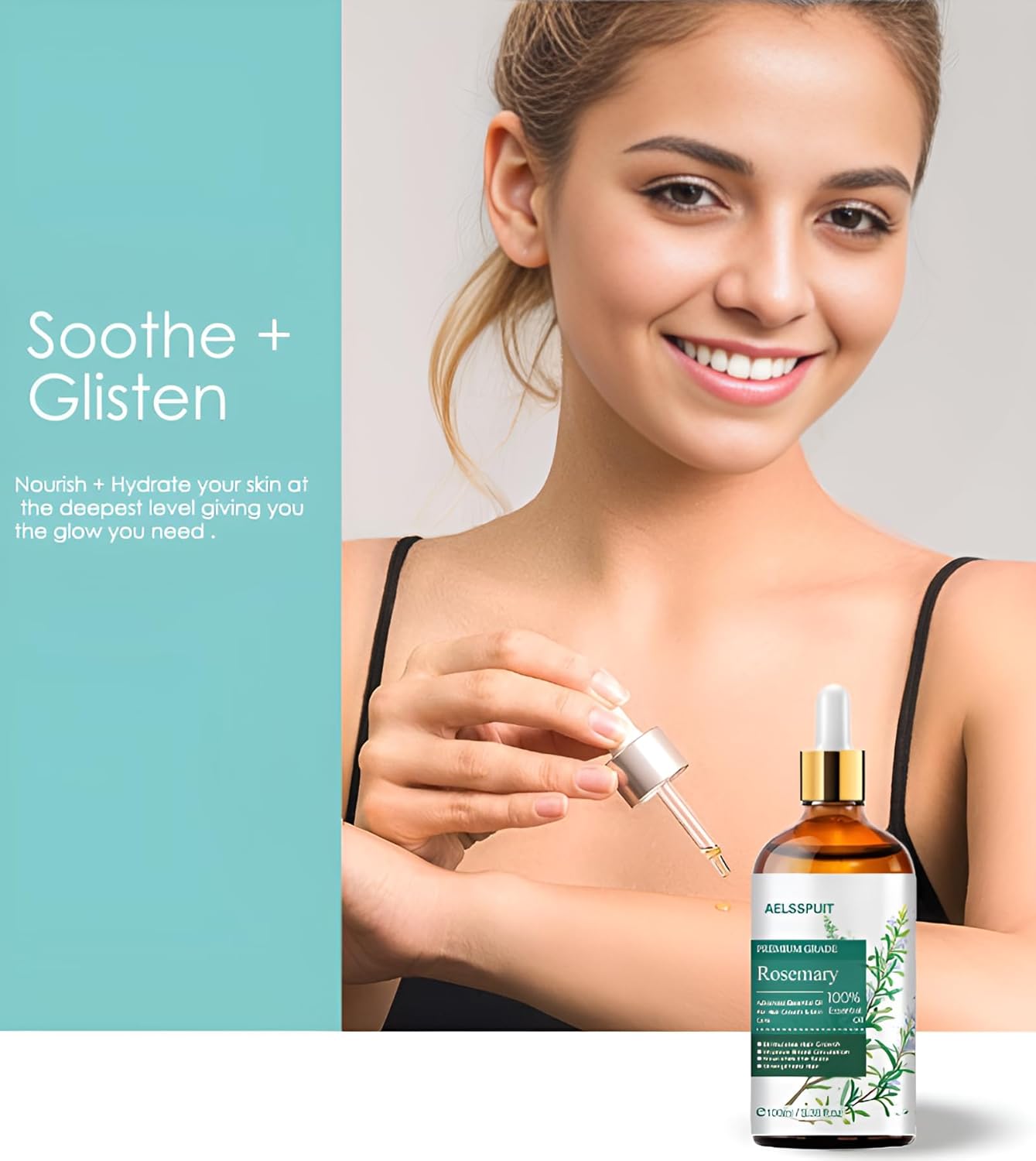 Rosemary Essential Oil for Hair Growth & Scalp Care - 3.38 Fl Oz (100ml) 100% Pure Organic Cold Pressed Oil in Glass Bottle - Aromatherapy Diffuser, Skin & Nail Treatment(Large, Rosemary)