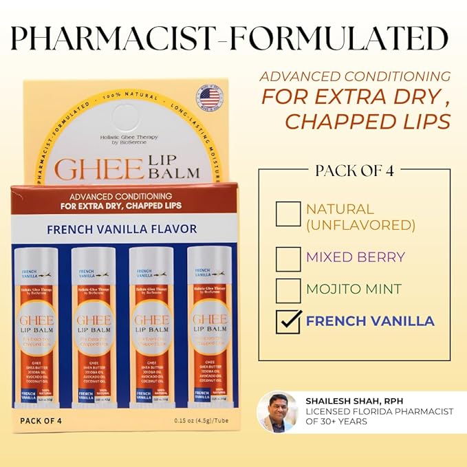 All Natural Lip Balm For Very Dry Lips | Hydrating & Moisturizing Lip Balm with Shea Butter, Ghee, Jojoba Oil, Coconut Oil | Chapped Lips & After Sun Care | BioSerene (4.5 gms/tube, French Vanilla)