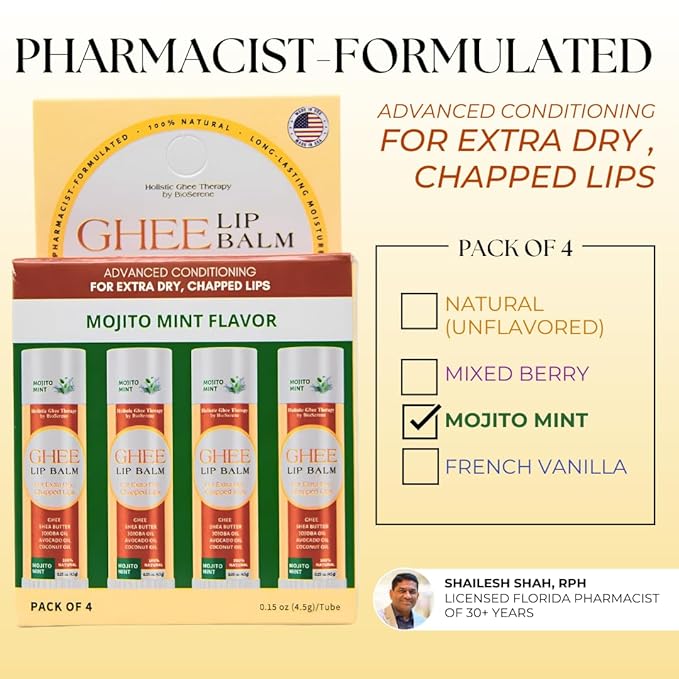 All Natural Lip Balm For Very Dry Lips | Hydrating & Moisturizing Lip Balm with Shea Butter, Ghee, Jojoba Oil, Coconut Oil | Chapped Lips & After Sun Care | BioSerene (4.5 gms/tube, Mojito Mint)