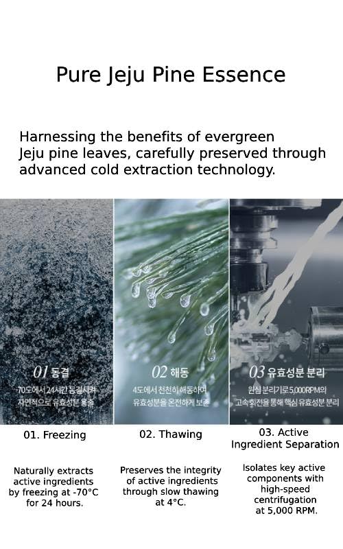 - Rich in Antioxidants: Jeju Pine Leaf Extract provides antioxidant protection, shielding the skin from environmental damage.