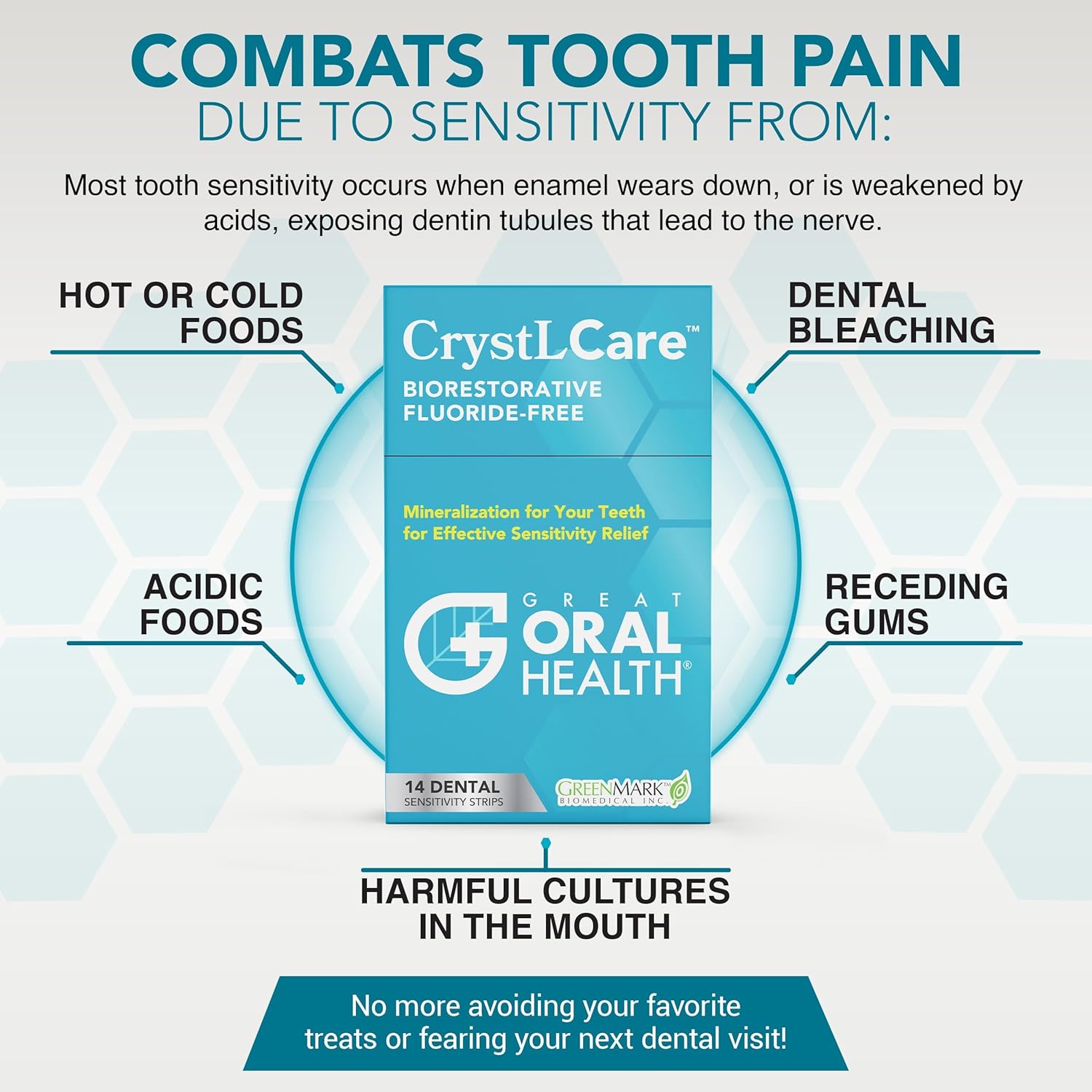 - THE SECRET TO LONG-LASTING PAIN RELIEF lies in repairing the root cause of the problem. Experience the future of dental care and transform your teeth with CrystLCare fluoride-free teeth strips. These tooth sensitivity pain relief strips rapidly eliminate discomfort, while helping to remineralize teeth and prevent early-stage caries. It's a one-two punch with potassium nitrate for immediate relief while teeth strengthening minerals seal off sensitive areas for long-lasting comfort.
