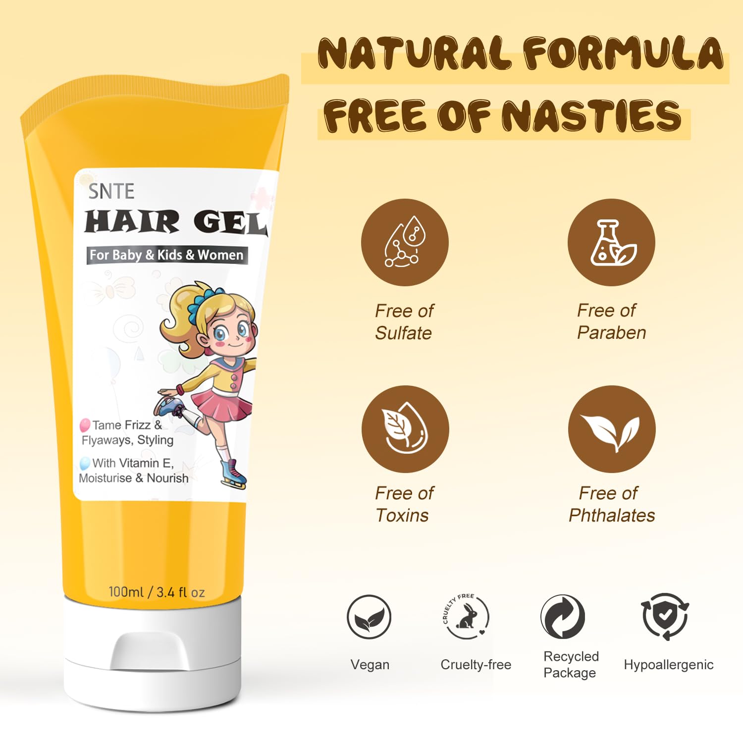 Samnyte Hair Gel for Kids, Baby Hair Gel Fly Away Hair Tamer, Styling Gel - Vitamin E Moisturize and Nourish, Flexible Hold Designed for Boys & Girls 3.4 Fl Oz