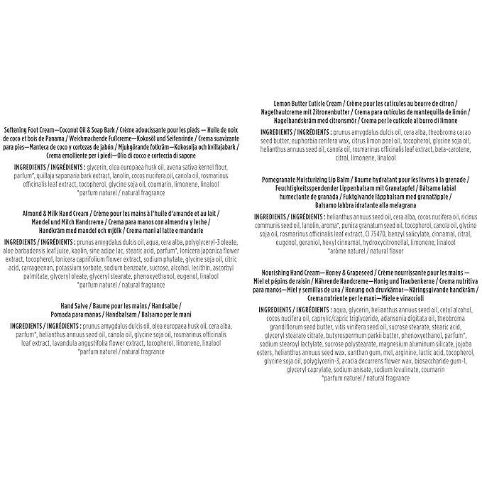 - INCLUDES: 0.75 oz. Softening Foot Cream, 0.25 oz. Almond and Milk Hand Cream, 0.3 oz. Hand Salve, 0.3 oz. Lemon Butter Cuticle Cream, 0.75 oz. Nourishing Hand Cream and 0.15 oz. Pomegranate Lip Balm