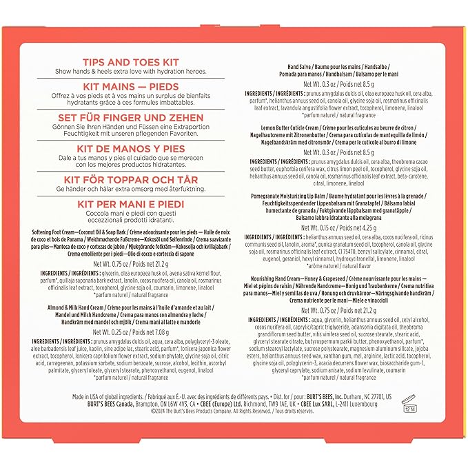 - GIFT SET: One Burt's Bees Tips and Toes Kit that includes six travel size skin care products, including foot cream, two varieties of hand cream, hand salve, cuticle cream and lip balm