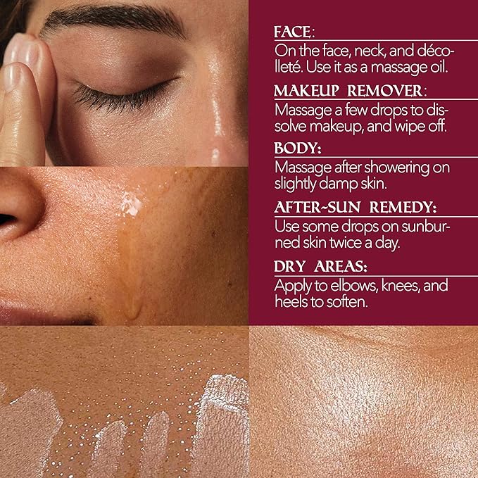 - SKIN Face: Use a small amount as a makeup remover, massage oil o makeup base. Body: Apply to damp skin after showering and massage until absorbed. After-Sun Relief: Apply to sunburned skin twice a day. Dry Areas: Apply to elbows, knees, and heels to soften.