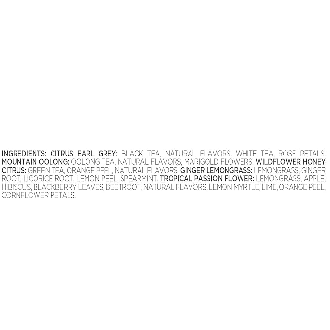 - TEA COLLECTION - 10 pyramid infusers with 2 of each tea blend: Chamomile Citron (herbal and caffeine free), Chocolate Rose (black and caffeinated), Green Mango Peach (green and caffeinated), Strawberry HIbiscus (oolong and caffeinated), and Vanilla Pear (white and caffeinated).