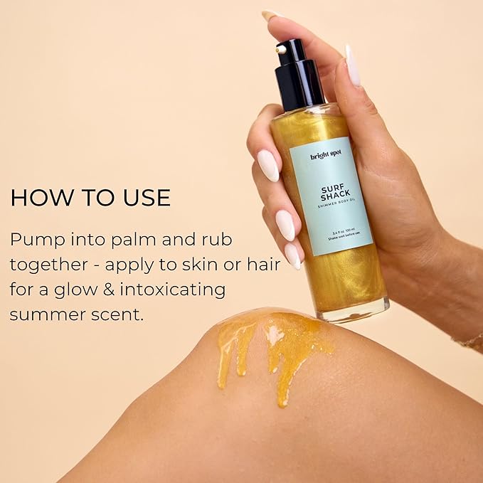 Body & Hair Shimmer Oil | Surf Shack Santal Coconut Scent Lightweight Oil for Luxurious Radiant Glow and Hydration for Body, Hair & Face 3.4oz Coconut, Santal, Sandalwood, Tonka Bean