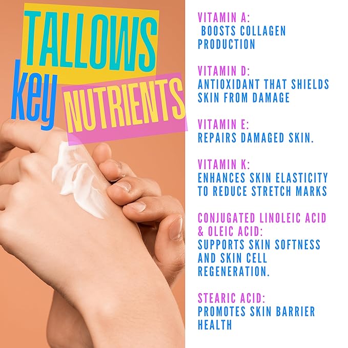 - DEEPLY MOISTURIZES AND NOURISHES-Our whipped tallow lotion is made 100% grass-fed beef tallow, a powerhouse of Vitamins A, D, E, and K that work to deeply hydrate and restore dry, sensitive skin. It mimics your skin’s natural oils for long-lasting moisture without a greasy feel.