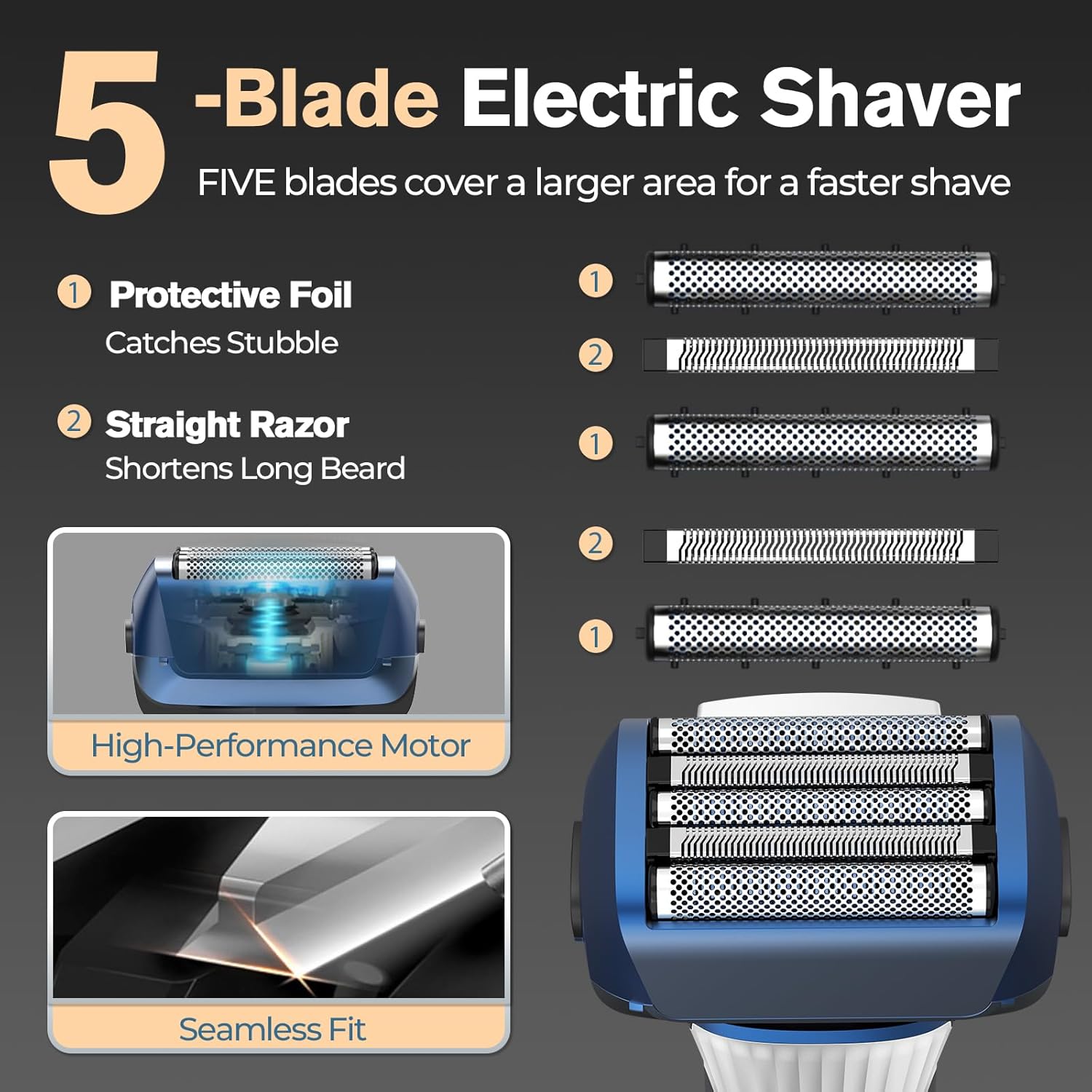 - Hassle-Free Cleaning: 5 blades foil men's razor is easy to clean with a soft brush or water rinse. Keep your electric shavers for men in top shape for hygienic, efficient shaving every day