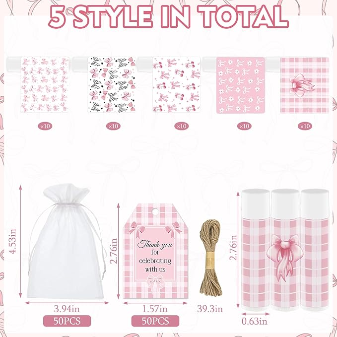 - ♥[Creative Design]:This vanilla flavoured pink bow lip balm gift comes with 50 lip balm in 5 different styles, beautifully designed with delicate patterns.Our card tags are also designed in pastel colours, they fit the organza gift bags and match into a perfect set, easily meet your gift giving needs.