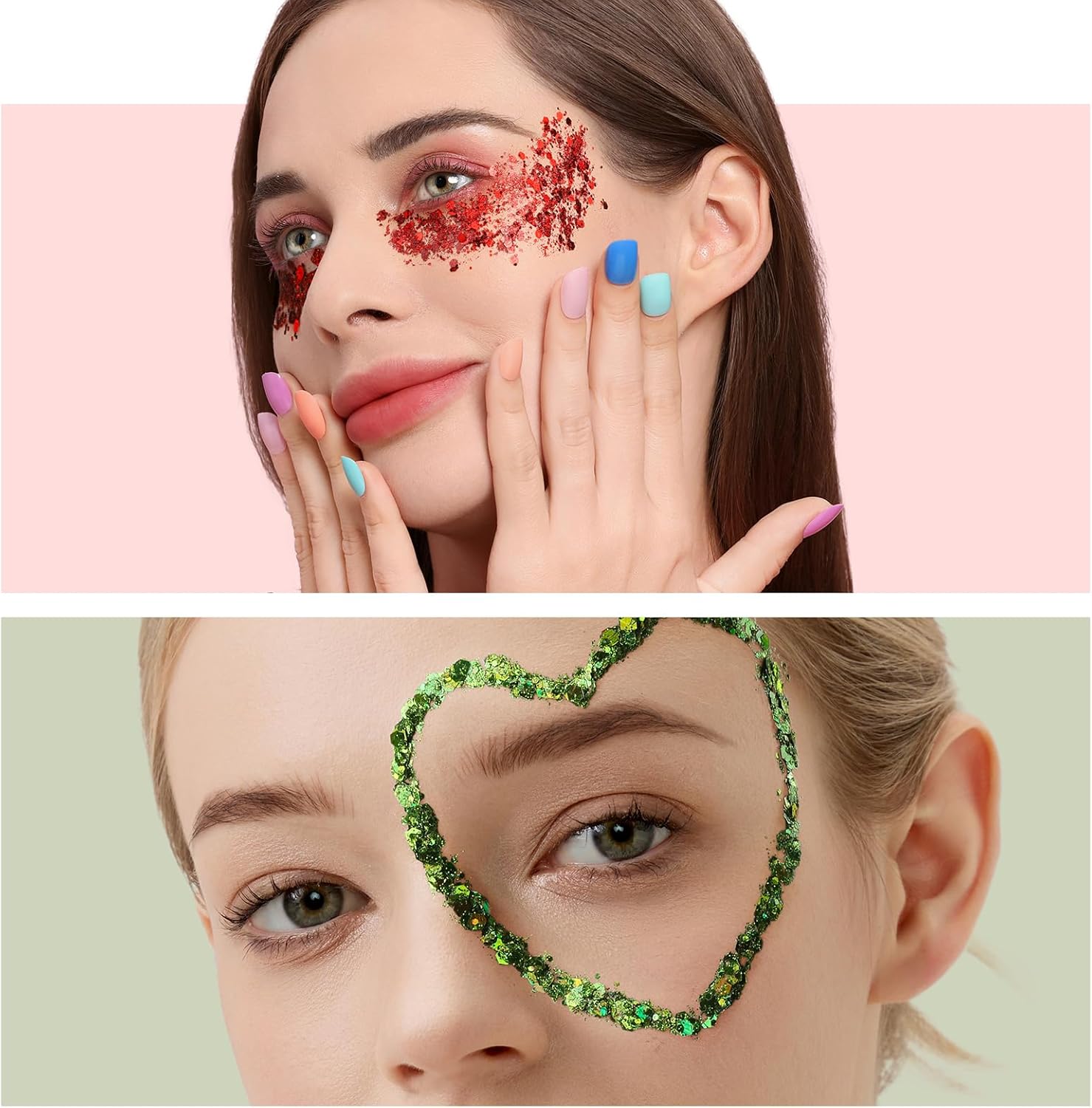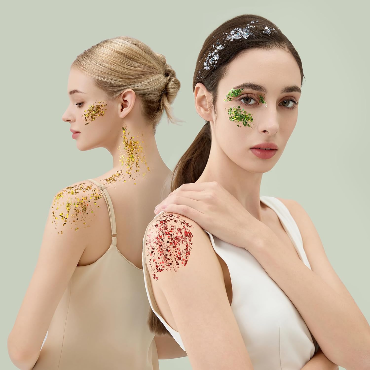 - FACE GLITTER GEL SET (NO GLUE REQUIRED) - this innovative glitter gel transforms into a silky, no-stick formula that glides on effortlessly! Designed for seamless application with fingertips or the included applicators, staying bold yet touchably comfortable. The glitter adheres instantly but rinses away effortlessly with lukewarm water, leaving no sticky residue behind. Say goodbye to messy prep and hello to hassle-free glam for parties, dates, or everyday sparkle