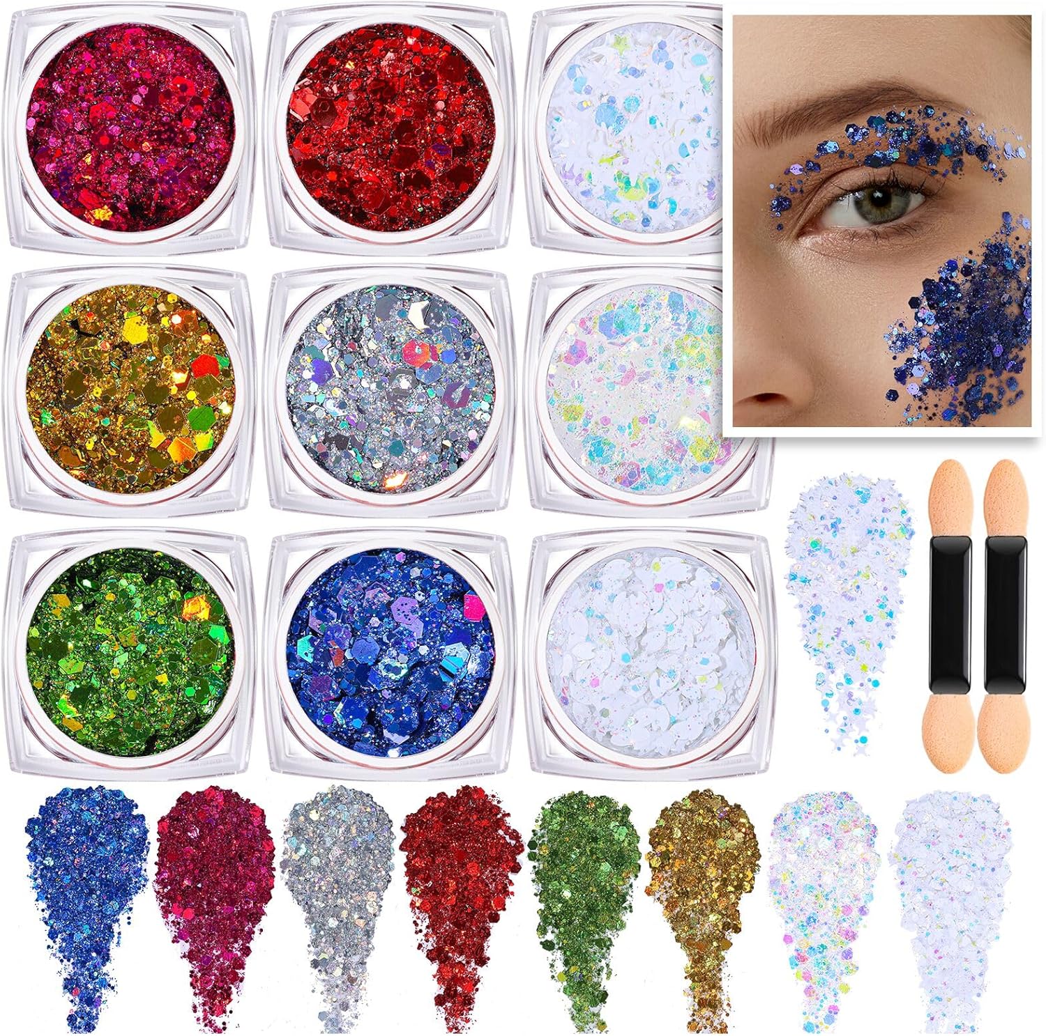 - FESTIVAL READY GLITTER GEL KIT - Unlock limitless sparkle potential with this pocket-sized glam arsenal! Packed with 9 bold, full-sized 5g glitter gels (neon blazers, metallics, holographics—you name it) and 2 precision cotton swabs for pixel-perfect application, this kit is your backstage pass to festival magic