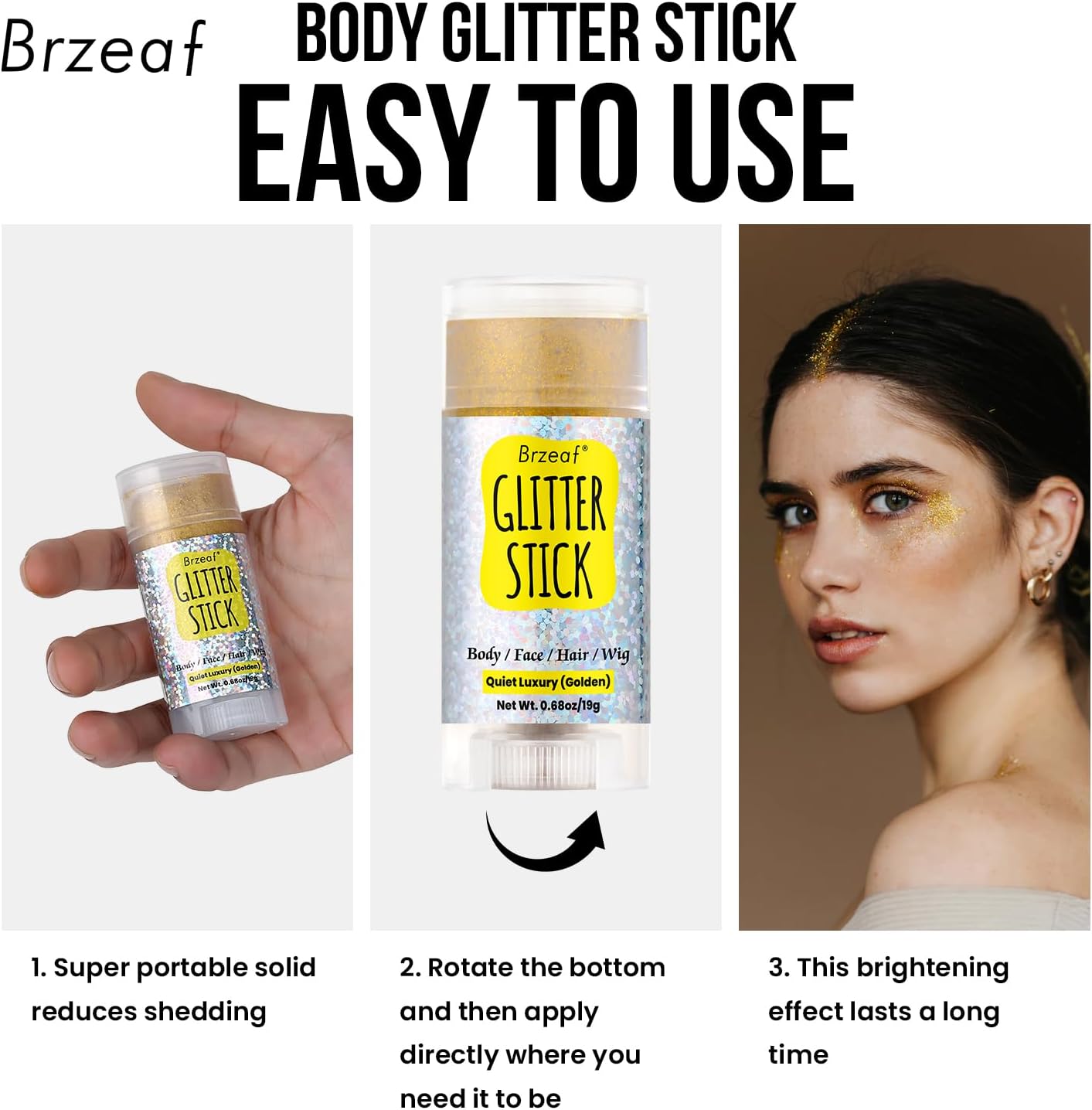 - 【Bright and Lasting Hold】Our golden glitter stick is makeup product designed specifically for use as accessories for events such as music festivals, concerts, parties or holiday raves. Body glitter stick is waterproof and sweatproof, not easy to come off, can hold makeup for 24 hours. Our face glitter stick will sparkle and shine, the color and shine of the sequins change with visual changes, releasing a dazzling light, allowing you to party and create your own sparkling look.