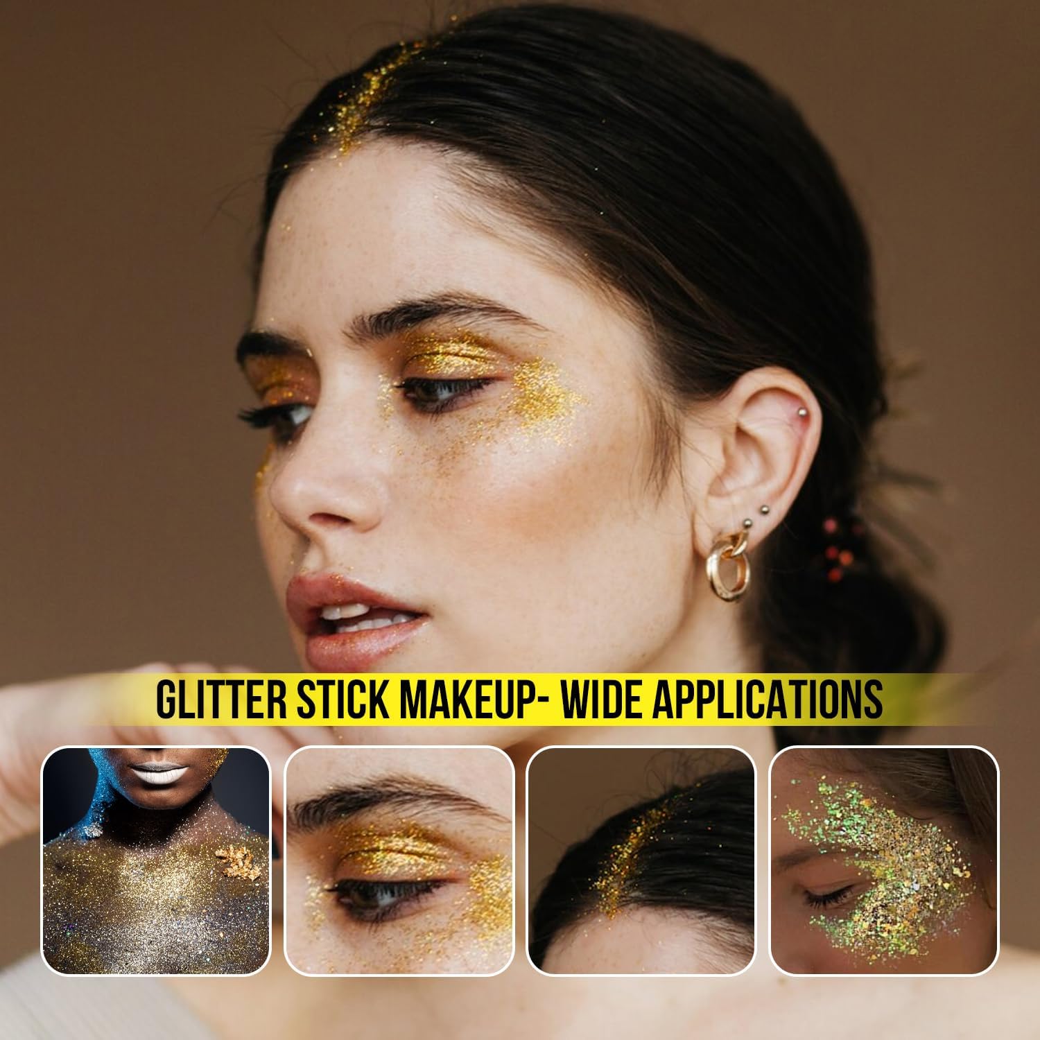 - 【Wide Range of Applications】Our gold glitter stick makeup can be used in many applications. For example, music festivals, concerts, birthday parties, stage performances, holiday events and various other occasions. You can in use glitter cream to decorate your face, hair, body, eye shadow and other various parts. Let your makeup shine all over, let the pearlescent illusion hold your beauty.