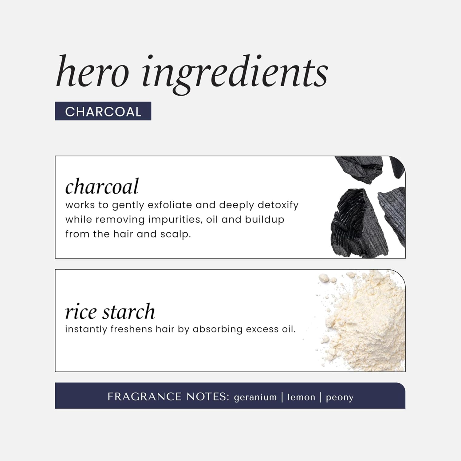 - Charcoal & Rice Starch | Infused with charcoal to gently exfoliate and detoxify, while rice starch absorbs oil and freshens hair, leaving it ultra-clean and purified without any gritty residue