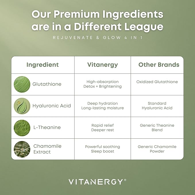 - 4-in-1 Beauty Sleep Formula – With Hyaluronic Acid (as Sodium Hyaluronate) for Deep Hydration & Reduced Glutathione to Support Even Tone – Plus L-Theanine & Chamomile for Relaxation
