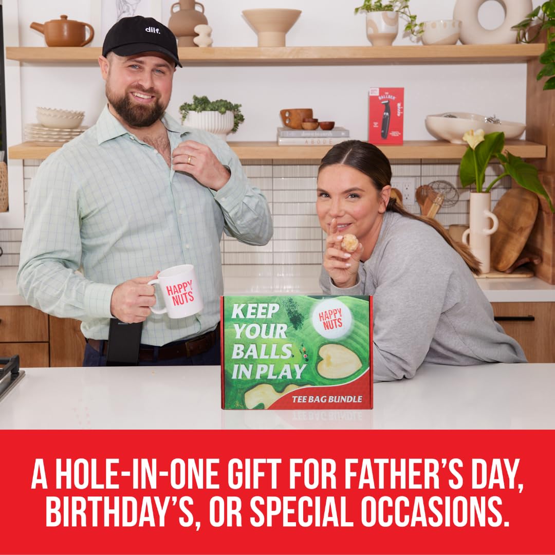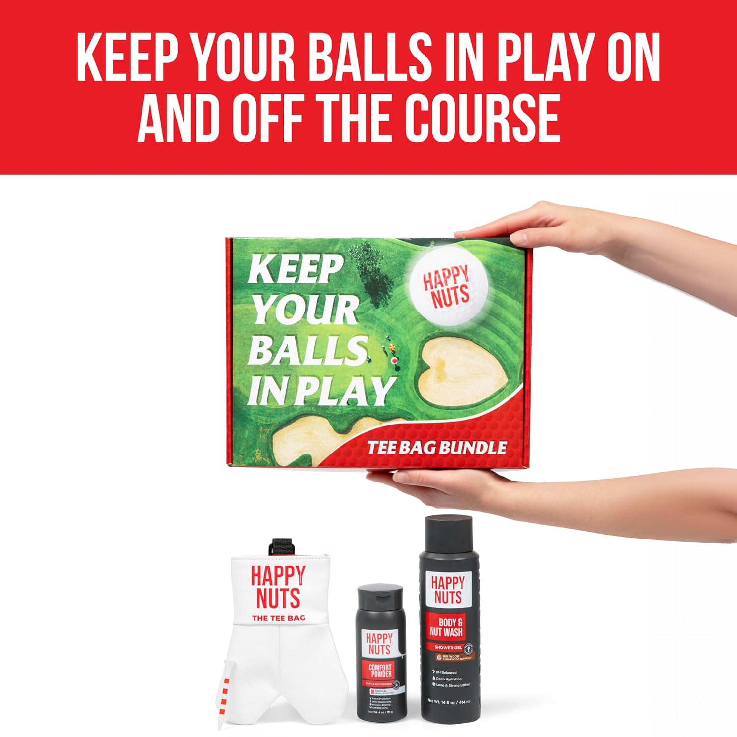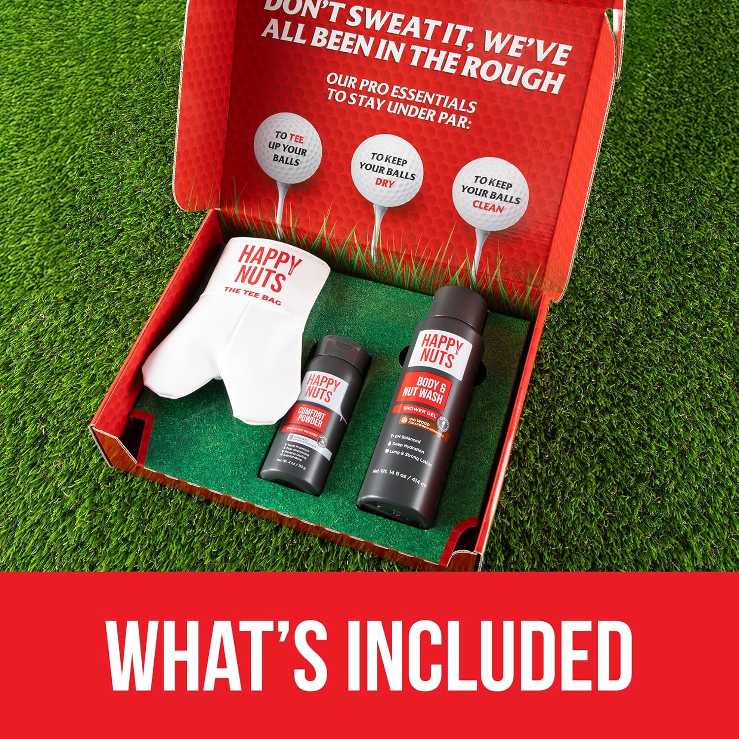 Happy Nuts Tee Bag Bundle for Men – Golf-Themed Grooming & Game Day Essentials - Perfect Men's Gift Kit for Golfers - Sandalwood Body Wash, Anti-Chafing Comfort Powder Deodorant & Golf Ball Tee Bag