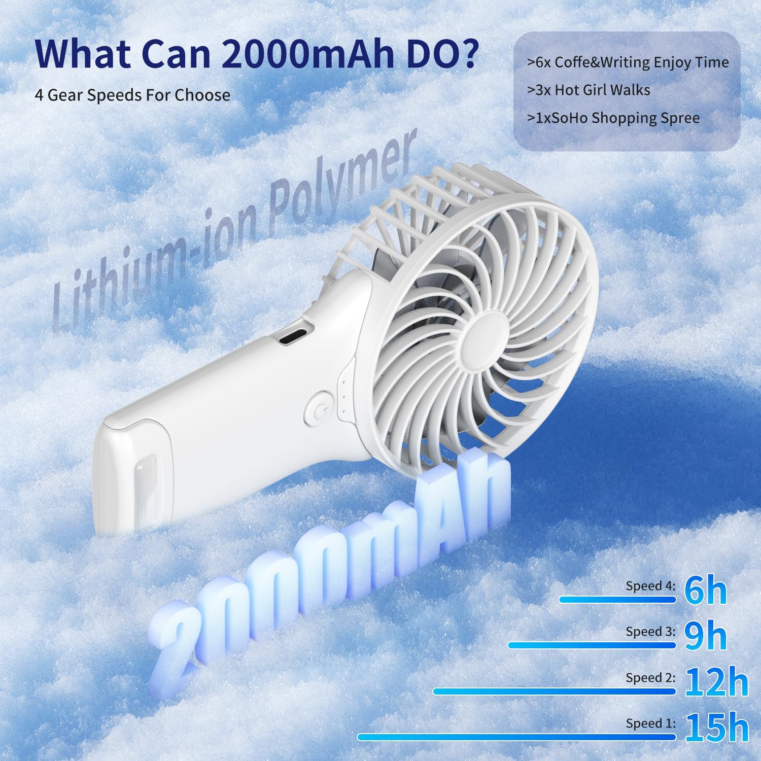 - 6x Coffe&Writing Enjoy Time | 3x Hot Girl Walks | 1x SoHo Shopping Spree Low-speed runtime: up to 15 hours. Built-in smart temperature control ensures no overheating.