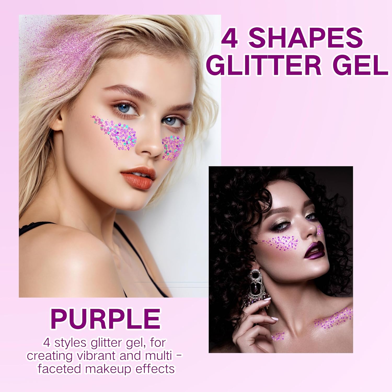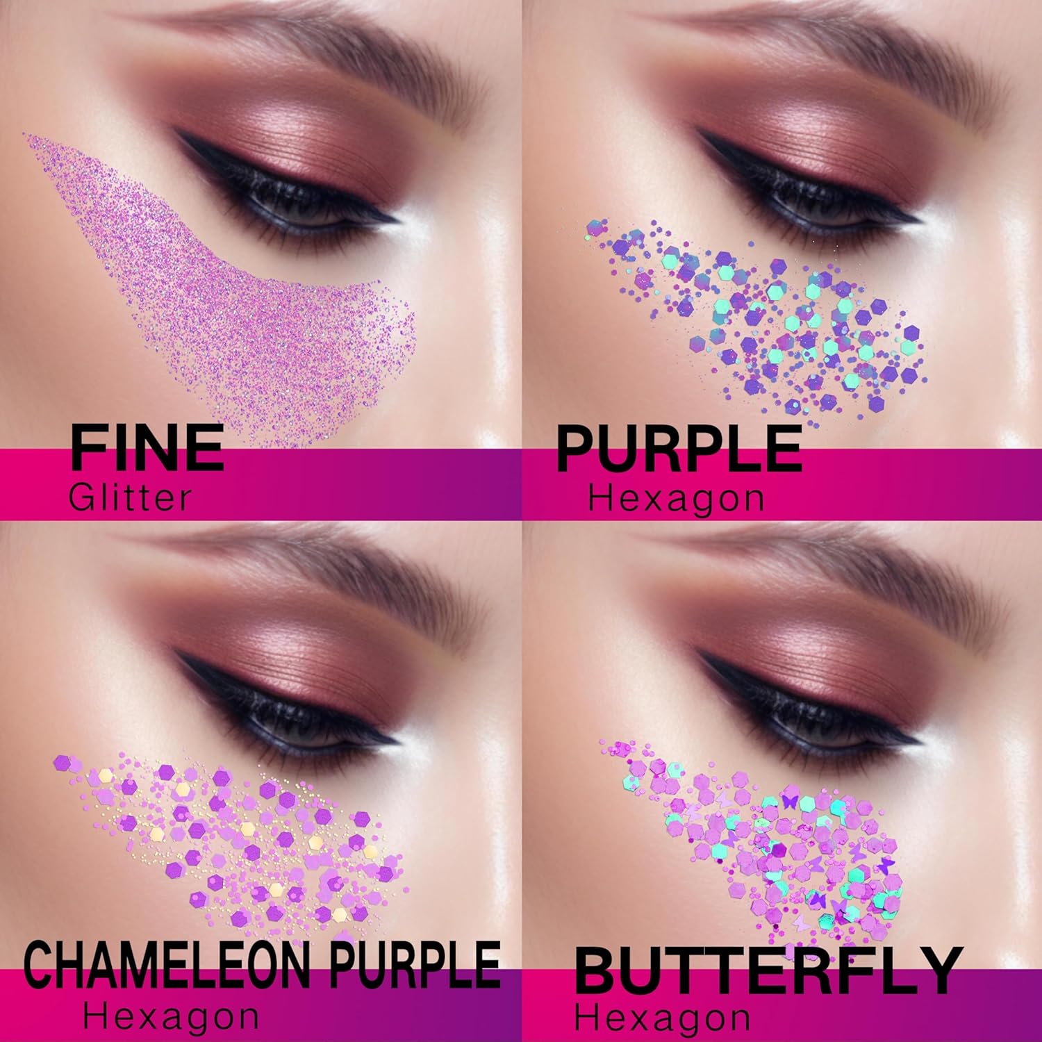 - 4 UNIQUE STYLES MERMAID FACE GLITTER :Paminify Purple Mermaid Face Glitter Gel comes in 4 stunning styles: pueple hexagon glitter, fine shimmer, chameleon iridescent purple, and butterfly glitter. Each adds a unique, eye-catching sparkle, perfect for creating mesmerizing rave festival and party looks