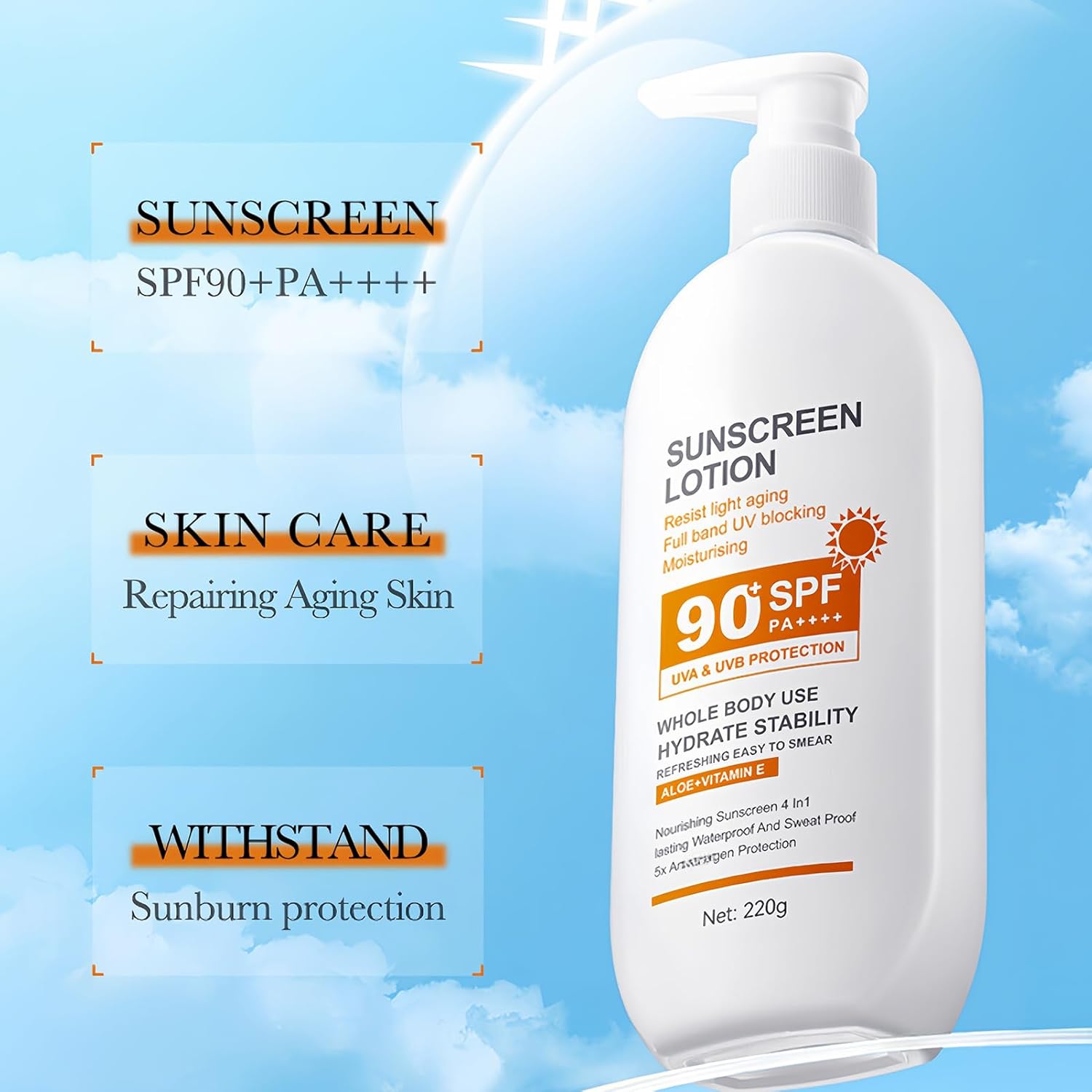 - 【Large Capacity 220G Bottle】 Designed for family use or extended trips, this large bottle of 90 SPF sunscreen offers more coverage for face and whole body. No need to worry about running out quickly