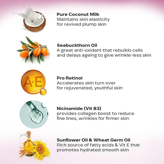 - Seabuckthorn a great anti- oxidant that fights aging signs, Retinol accelerates skin turnover to give rejuvenated & youthful skin, and Niacinamide (Vit B3) reduces fine lines, and wrinkles for radiant skin