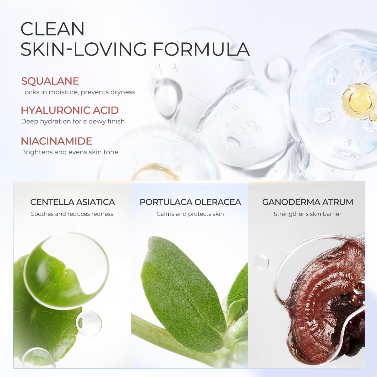 - CLEAN SKIN-LOVING NATRUAL FORMULA. The finishing powder make up includes many healthy and natural ingredients, such as SQUALANE to lock in moisture, prevent dryness; HYALURONIC ACID for a dewy finish; NIACINAMIDE to brighten and even skin tone; CENTELLA ASIATICA to sooth and reduce redness; PORTULACA OLERACEA to calm and protect skin; GANODERMA ATRUM to strengthen skin barrier. Great for all skin types.