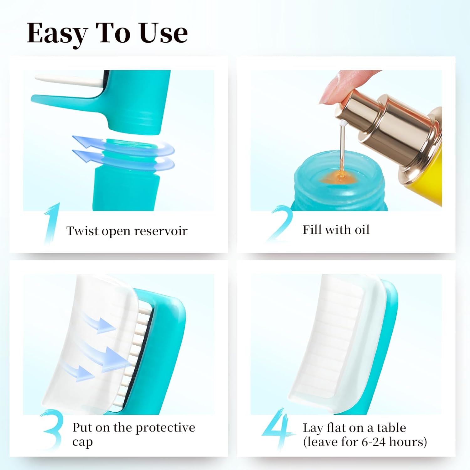 - Easy to Use: Simply pour in the oil, cover with the protective cap and leave the hair oiling comb flat on the table for 6-24 hours. When the hair oiling applicator comb teeth are full of oil, it is ready to use. After first adding oil, it lasts about 1 week.