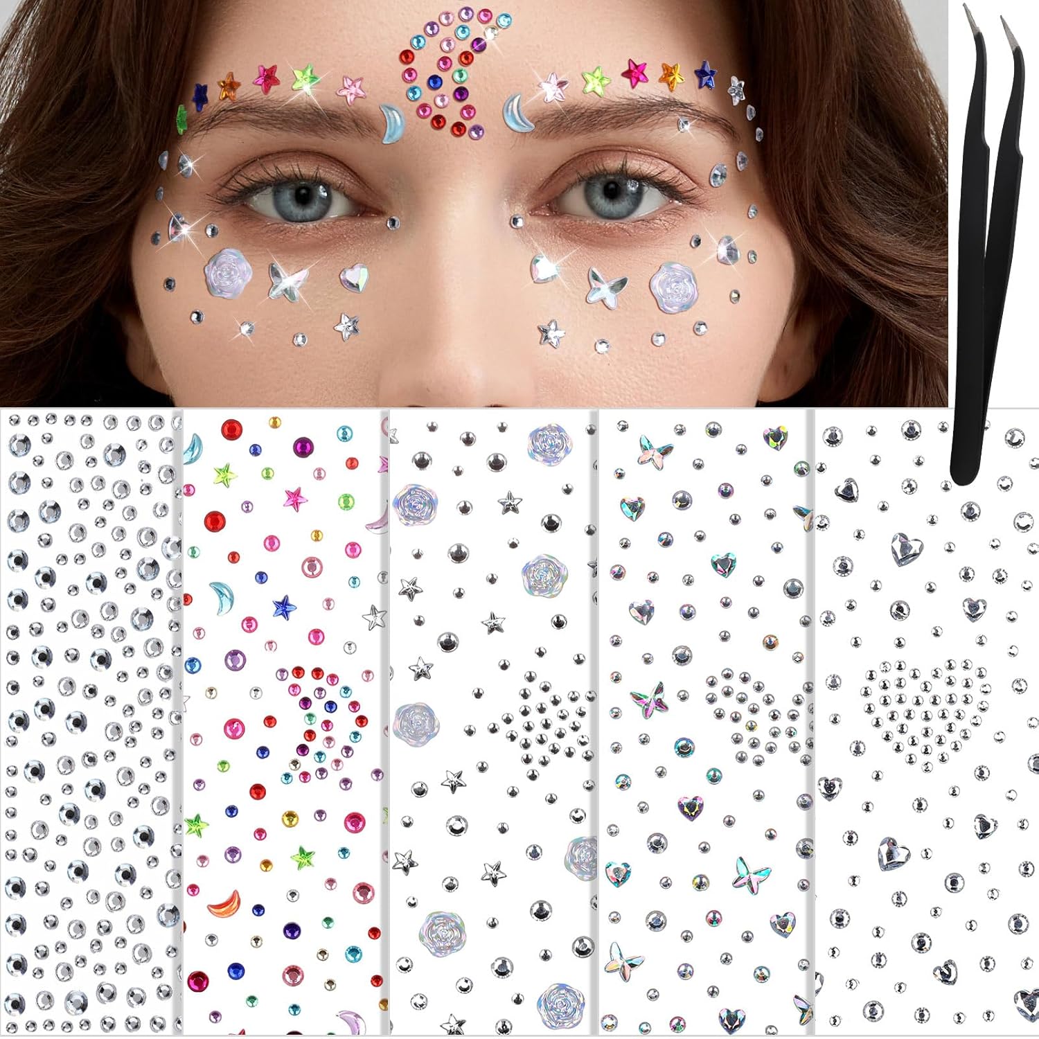 - Self- Adhesive Face & Hair Gems No glue, no mess -each face and hair gems is self-adhesive for quick, hassle-free application. The face jewels set included tweezers make it easy to place even the small gems exactly where you want them. And, the compact stickers sheets are lightweight and portable, perfect to slip into your makeup bag or take on the go for festivals, parties, or touch-ups anytime!