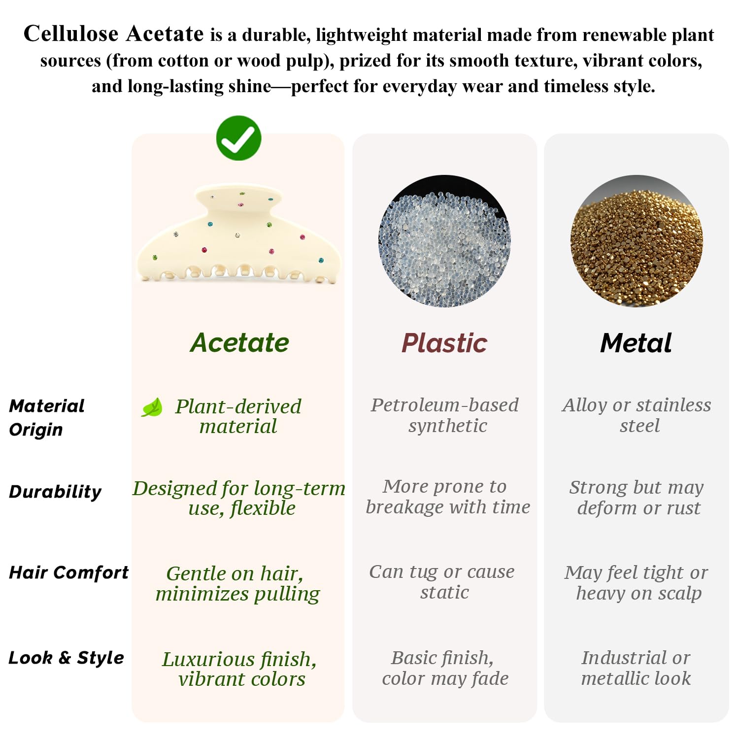- PREMIUM ACETATE MATERIAL: Made from high-quality plant-derived Cellulose Acetate, this claw clip is more flexible and longer-lasting than regular plastic clips. Known for its smooth texture and gentle feel on hair, it offers a refined, everyday alternative to petroleum-based plastics