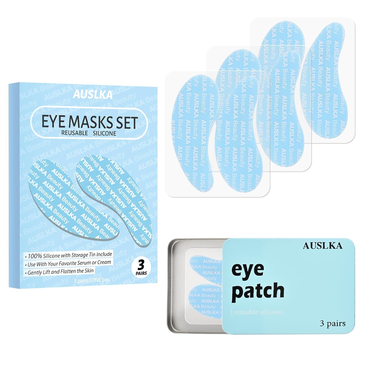 AUSLKA Reusable Under Eye Patches-3 Pairs, Silicone Reusable Eye Masks, Reusable Eye Wrinkle Patches, Silicone Eye&Face Mask for Fine Lines & Dark Circles, Storage Tin Included