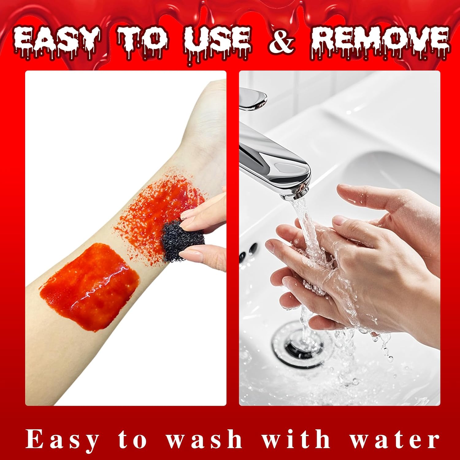 - EASY TO REMOVE BY WATER :Cleanup is simple. Just use warm water and mild soap to wash away the fake blood—no staining, no scrubbing. Perfect for quick removal after events, parties, or performances without irritating your skin