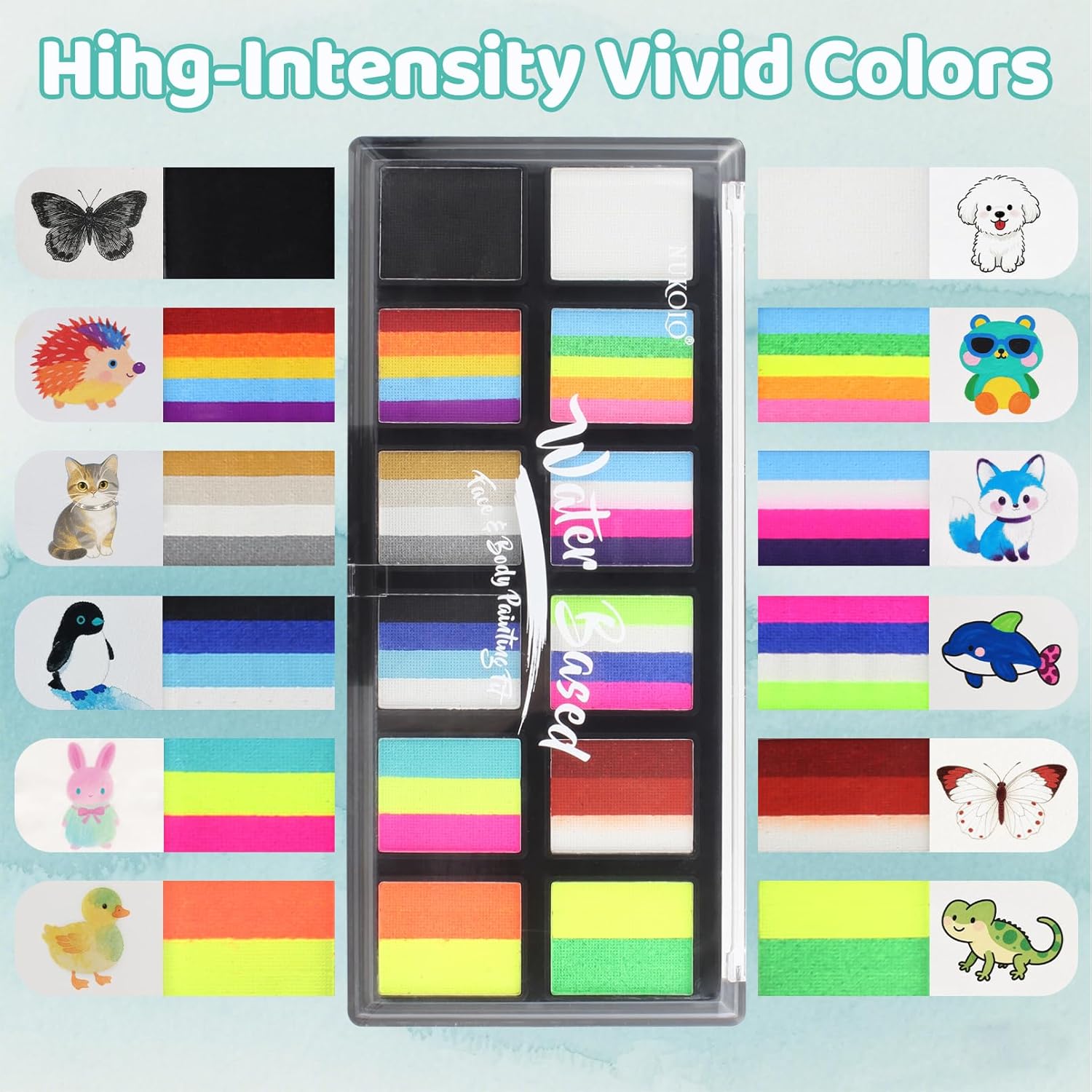 - Vivid & Blendable Colors:Our professional face paint Kit is perfect for both kids and adults.It is based on mineral pigments, offering highly pigmented and good coverage , ideal for detailed designs . Whether you're looking for a subtle look or a truly scary Halloween makeover, this professional face painting kit meets your needs