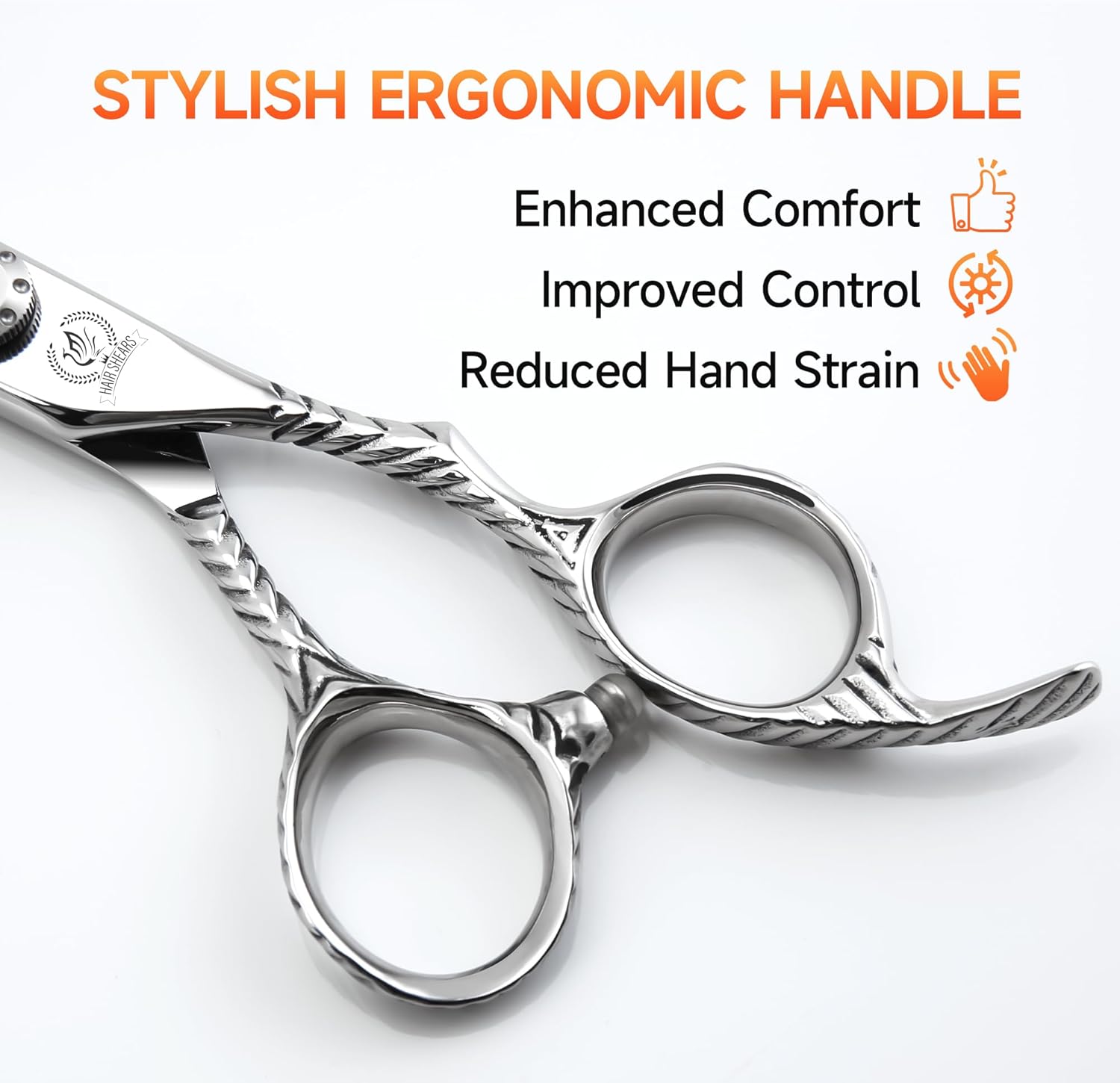 - Ergonomic Handle with Sculpted Design: Fenice Peak haircut scissors feature an ergonomically designed handle that fits naturally in your hand to reduce strain during long cutting sessions. Crafted with precision carving, the sculpted handle adds a touch of elegance and style—making these barber scissors not only comfortable, but also visually striking.