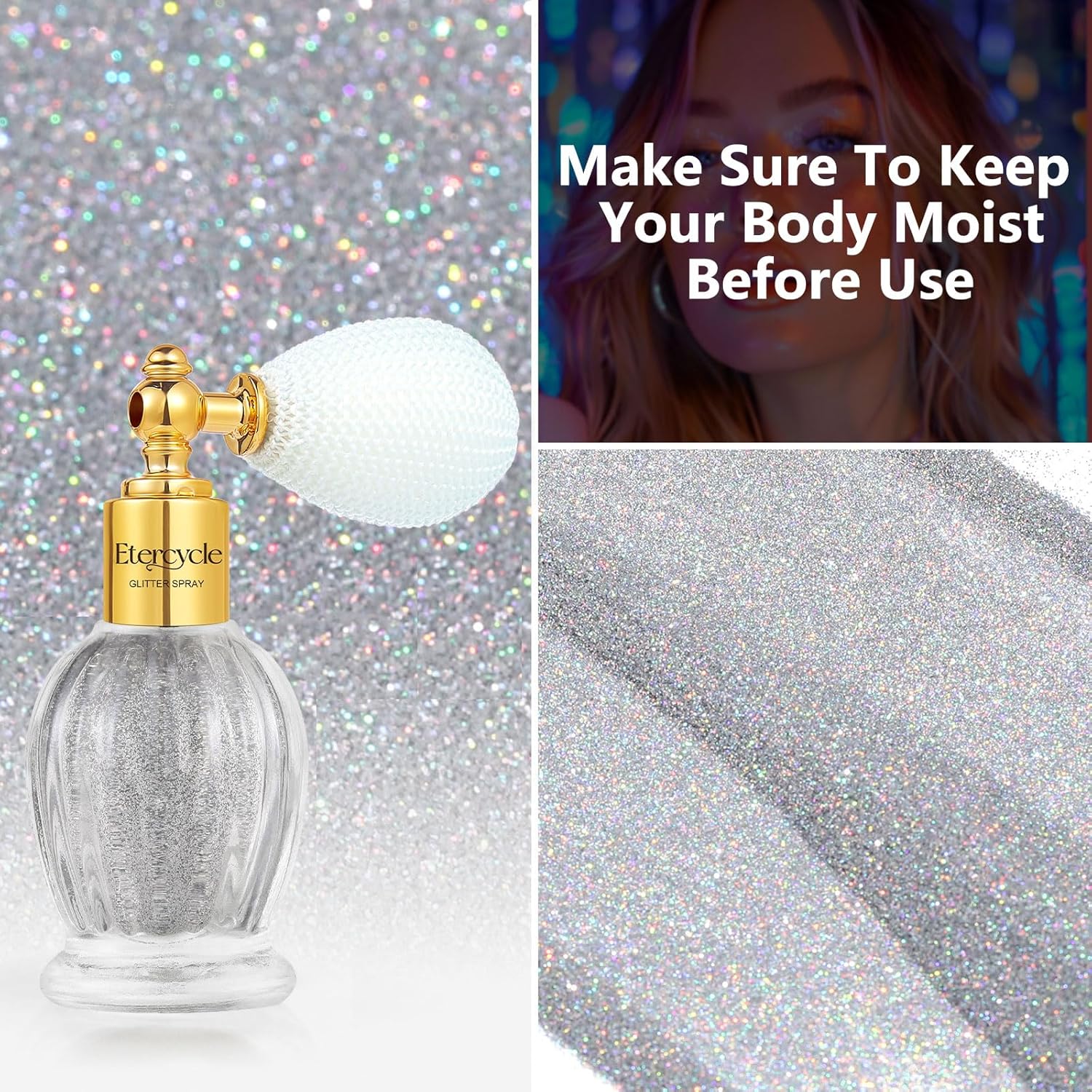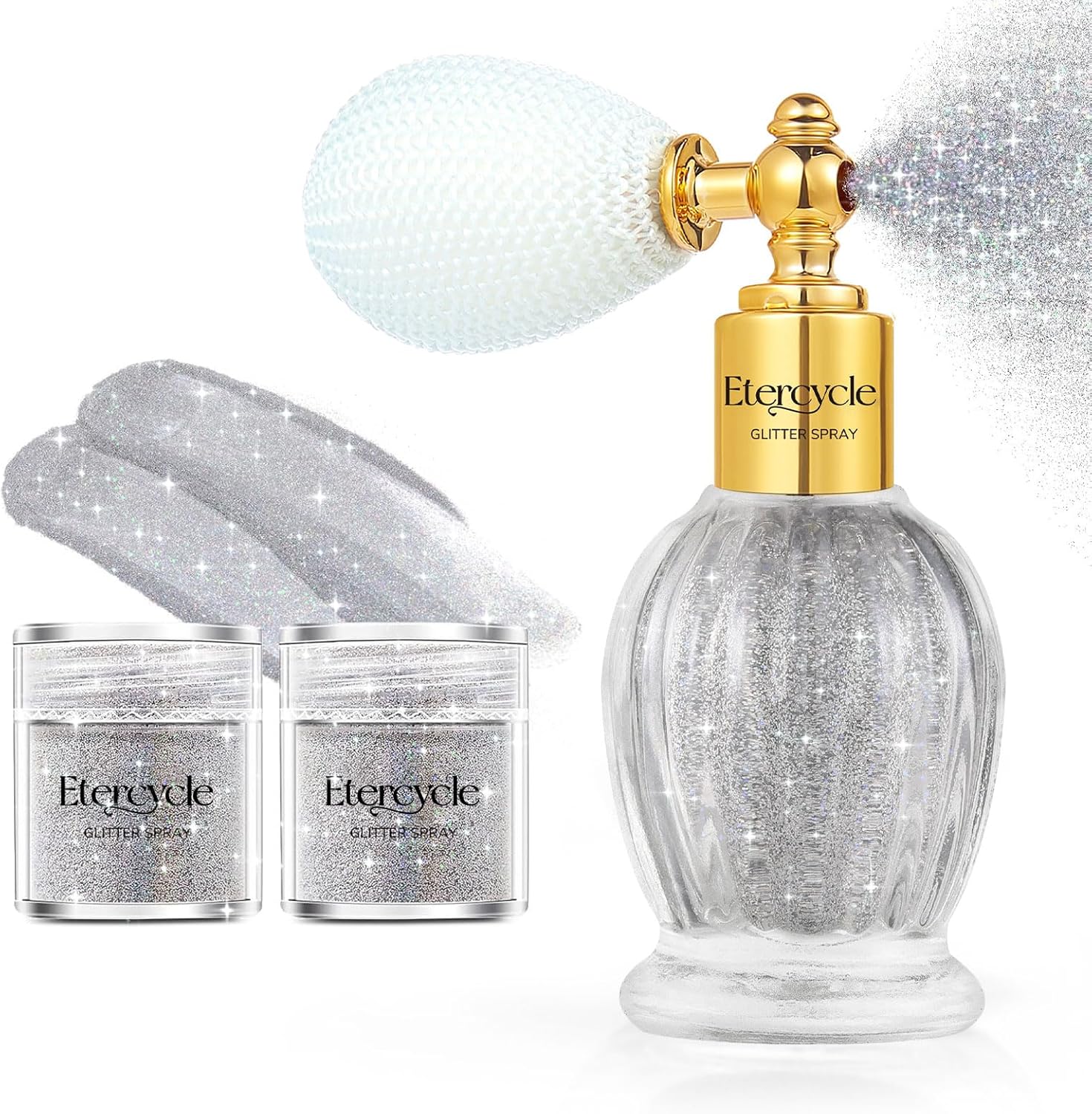 - Safe Body Glitter Spray: You can't tell if the cosmetic ingredients in other gel sequins are harmful to your skin, Etercycle Shimmering Spray Powder Sparkle Powder made of high-quality safe and healthy materials, is cruelty free without any animal tests.Glitter spray suits for all skin types and all ages, making your skin shiny, transparent and without block pores, while keeping skin breath freely and luster like the skin itself