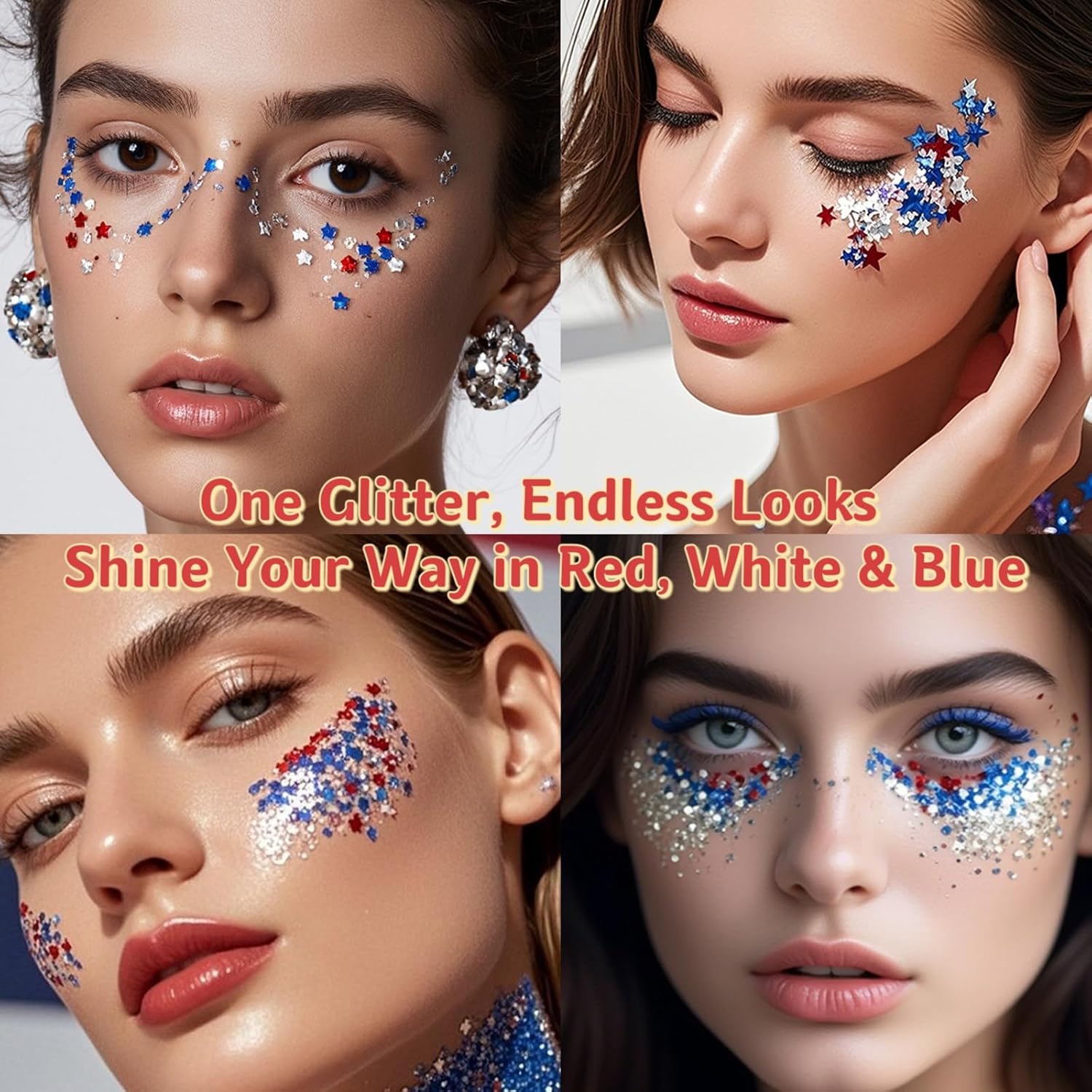 - Long-Lasting & Easy to Use --- With a strong hold and sweat-proof formula, the clear glitter glue in this kit keeps your sparkle secure from day to night—no melting, no mess. Whether you're dancing in the sun or watching fireworks, this 4th of July glitter won't budge. It’s also easy to remove with water, soap, or makeup wipes