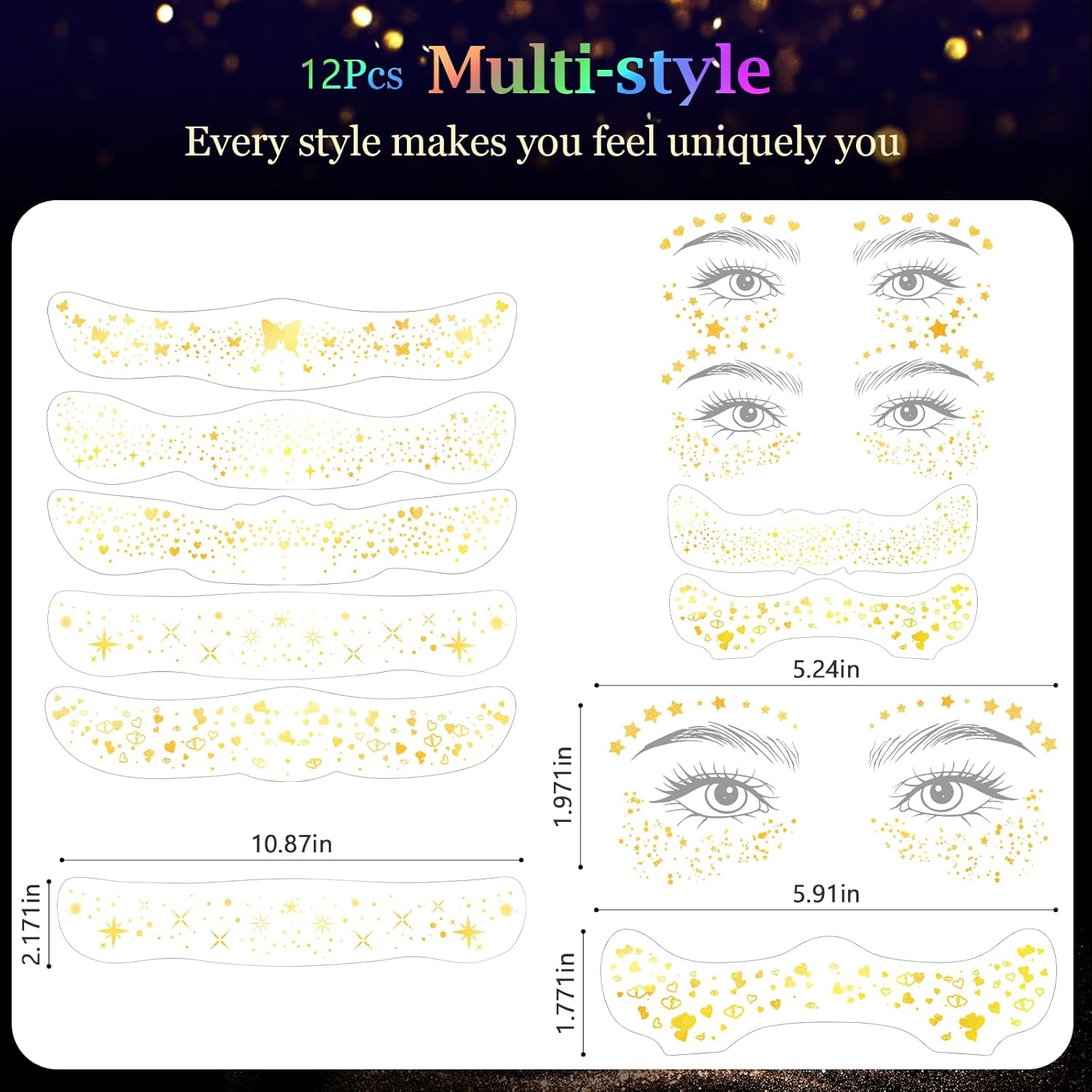 - VERSATILE STYLE COMBINE: Our glitter freckles face tattoo contain 9 pcs. Includes 4 gold face glitter patches and 5 clavicle makeup patch. The face patches add playful charm and allure to your complexion, while the clavicle glitter stickers designs highlight your neckline with radiant sparkle. Mix and match freely to create endless dazzling looks. Whether you’re going for a subtle shimmer or a statement-making glow, these sparkle freckles for women let you customize your style for any occasion